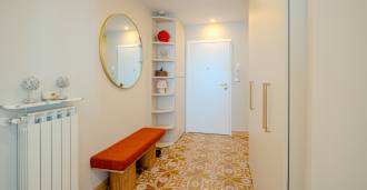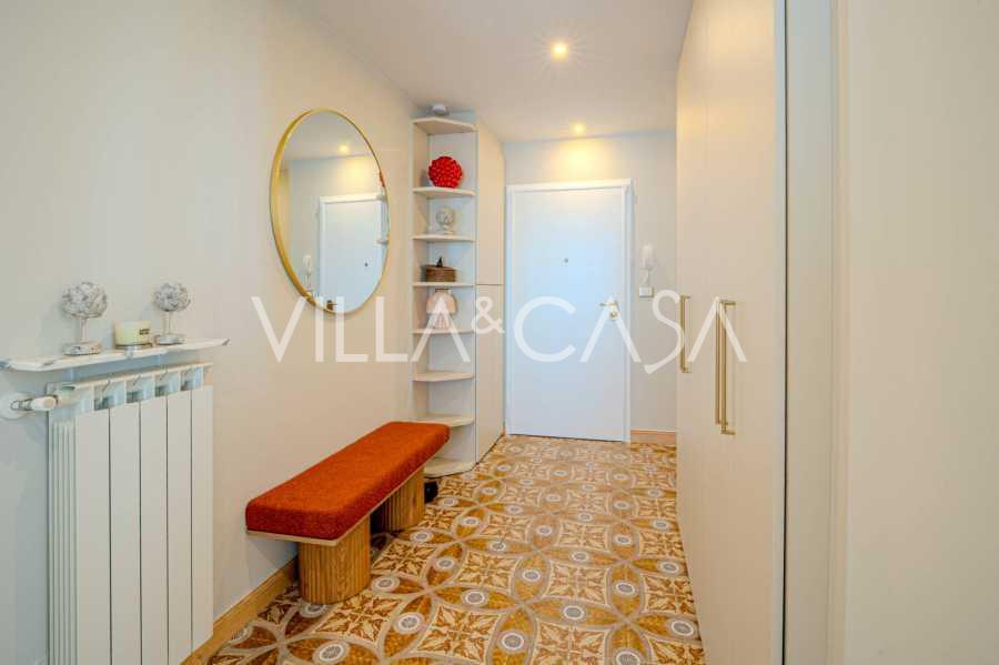Interiøret i leiligheten kombinerer moderne komfort med en koselig atmosfære. En romslig entré fører til en praktfull stue med åpent kjøkken, hvorfra det er en fantastisk utsikt over havet. Fra stuen kan man gå ut til to balkonger, hvor det er hyggelig å nyte brisen og panoramautsikten over den liguriske kysten.