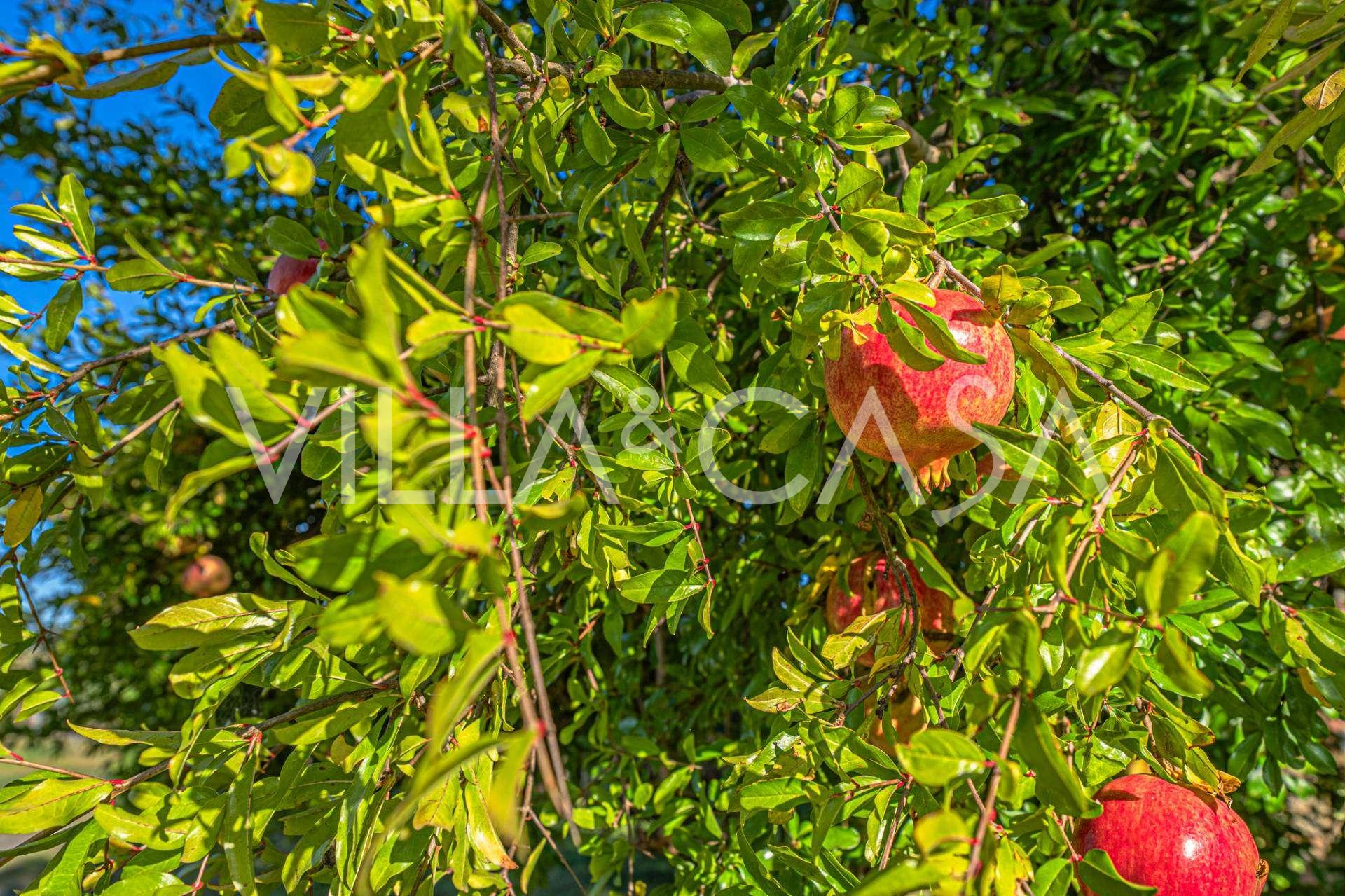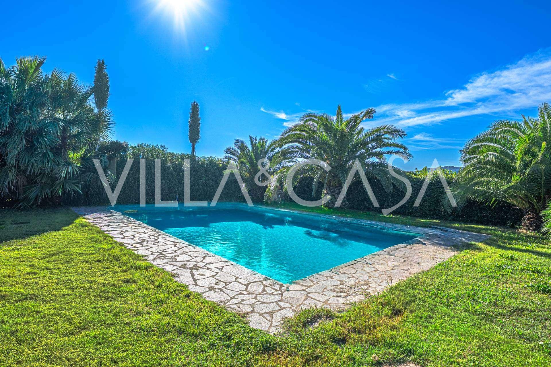 Utenfor, blant velstelte plener, er det innredet avsidesliggende avslapningsområder med elegant hagemøbler og en grillplass, perfekt for middager under åpen himmel og kveldsarrangementer. Fra hagen fører pittoreske stier til middelhavslandskapene, som inviterer til turer. Sportsentusiaster vil sette pris på nærheten til to prestisjetunge golfklubber, bare noen få minutters kjøring unna.