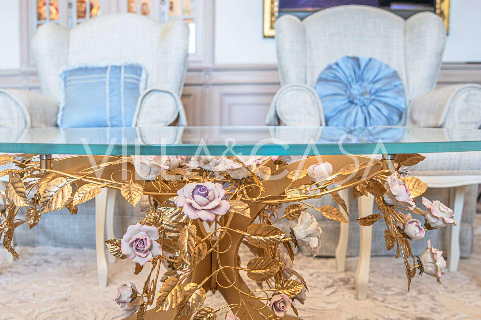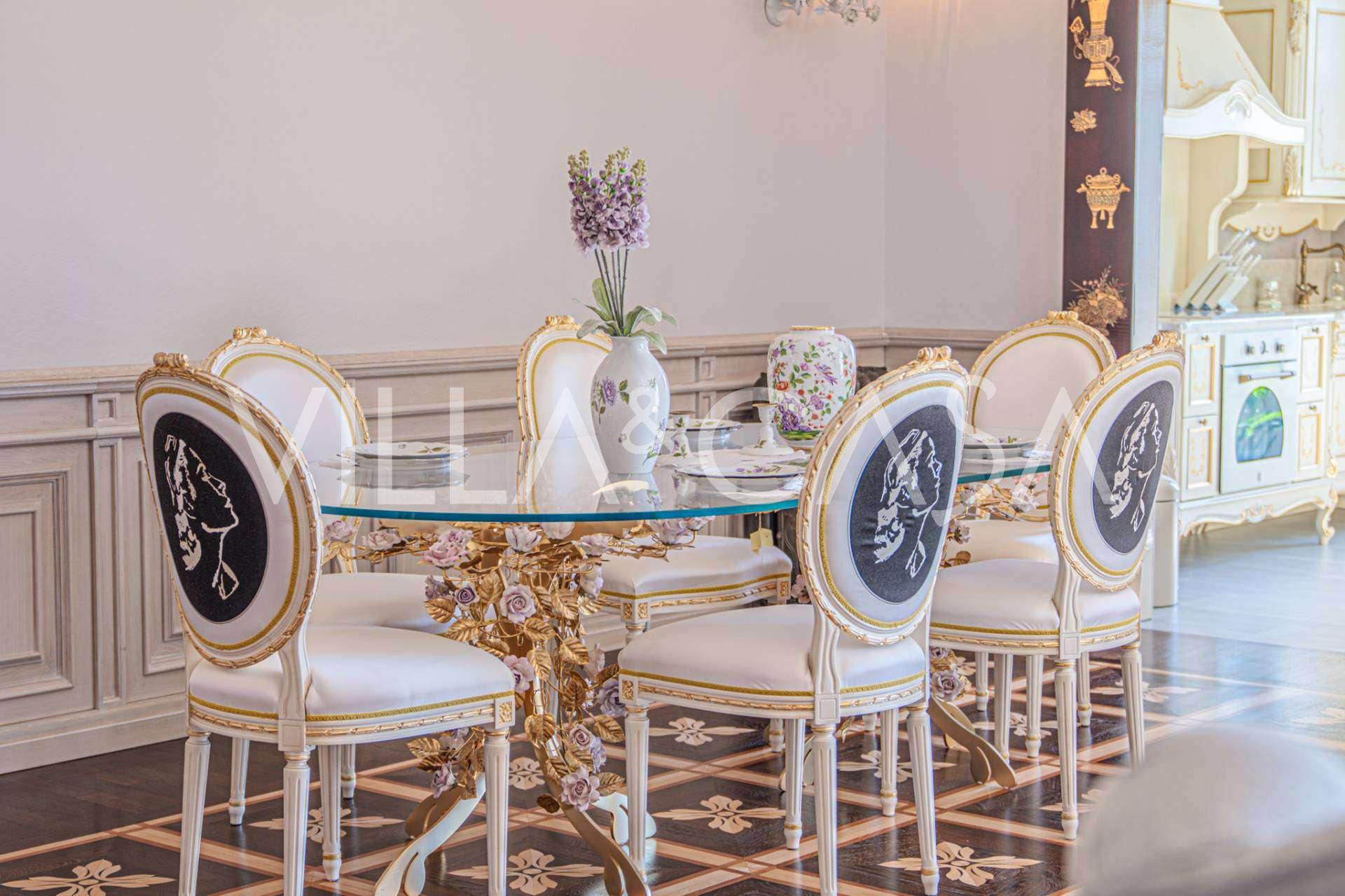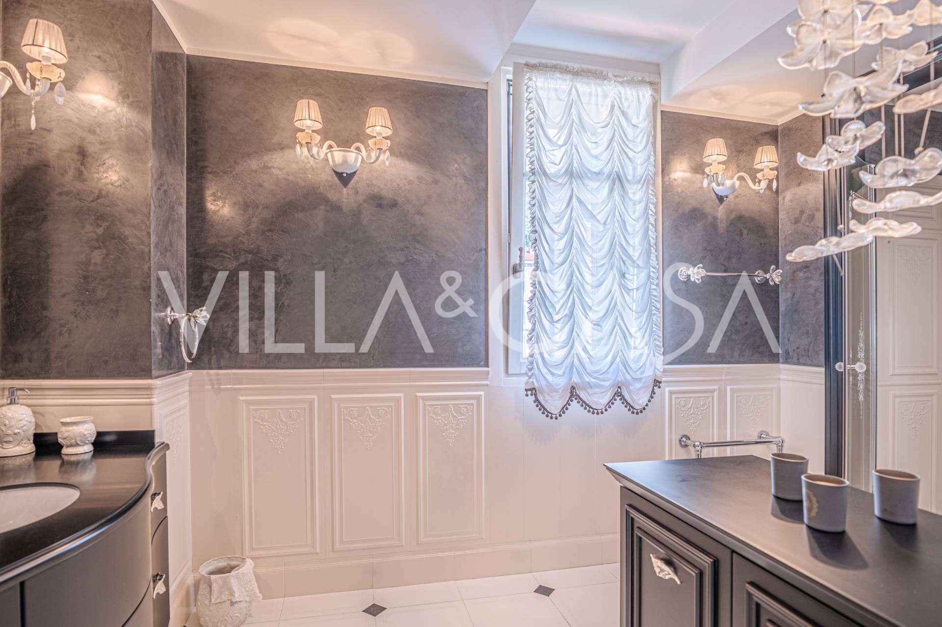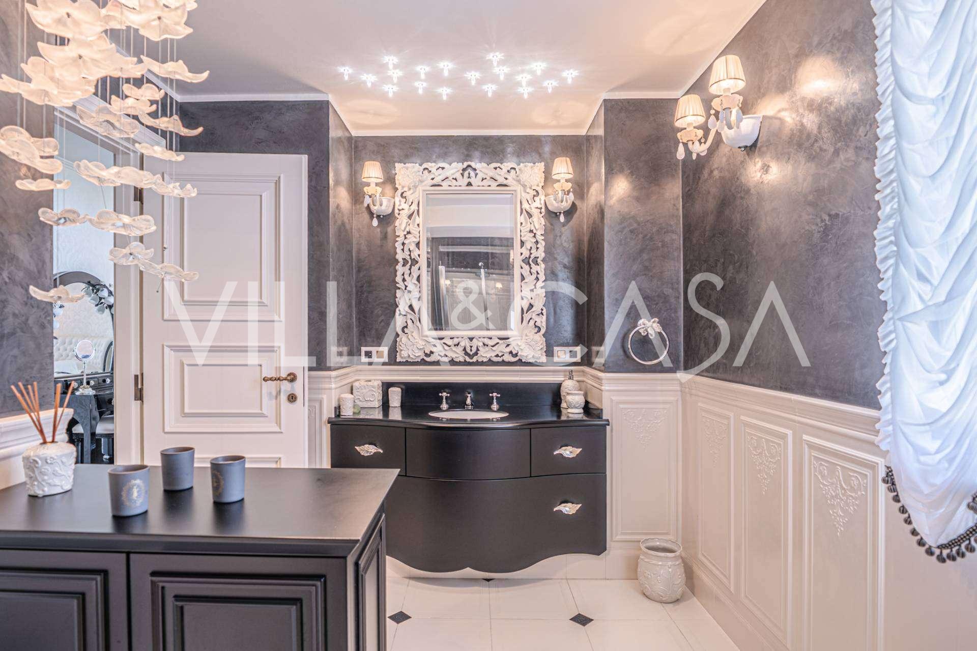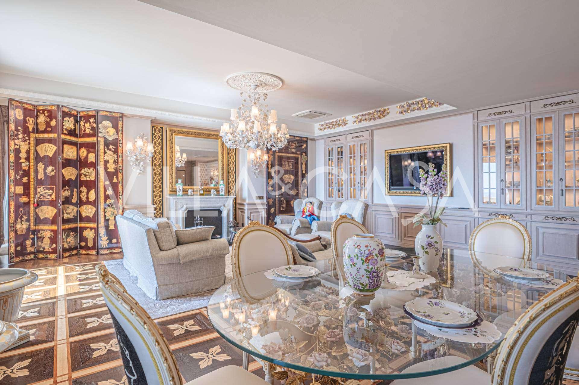 Innredningen er utført med eksepsjonell oppmerksomhet på detaljer: parkett i stuen, varm parkett i soverommene, prestisjefylt keramikk på badene, lakkerte treluker og vinduer med dobbeltglass, lysekroner og lamper fra Villari, garderober fra Franco Martinello, dører fra et kunstverksted i Paris, silketapet, silketepper i salongen og soverommet som sikrer stillhet og komfort. Moderne oppvarmings- og klimaanleggssystemer garanterer komfort til enhver årstid.