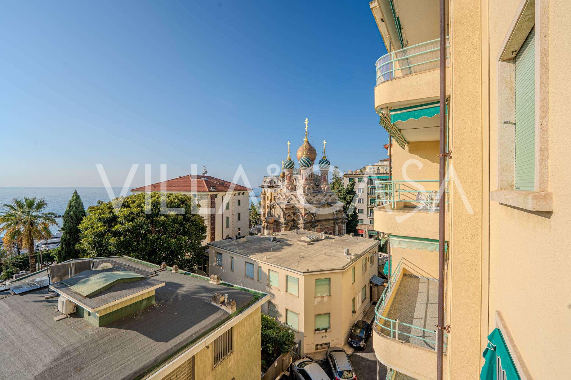 Romslig fire-roms leilighet ligger i sentrum av Sanremo, rett overfor den vakre russiske kirken, i et prestisjefylt boligkompleks med velholdt område. Leiligheten er på 104 m2 og ligger i fjerde etasje, hvorfra det er utsikt over havet og den unike arkitekturen til den russiske kirken.