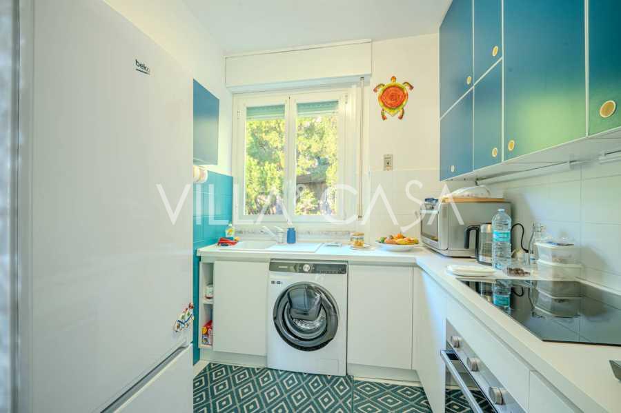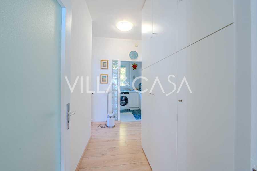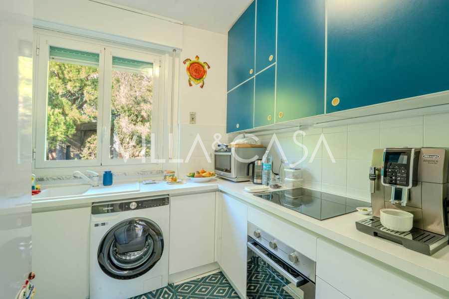 Planløsningen inkluderer: stue, kontor, to soverom, hvorav det ene har havutsikt, kjøkken-spisestue, to bad med vinduer, entré og korridor. Leiligheten har autonom oppvarming, mulighet for å installere aircondition, en garasje på 20 m² med en takhøyde på 3,50 m og mulighet for å lage en mesanin, samt en romslig terrasse for avslapning. Det er ingen kjeller, men garasjen kompenserer for oppbevaring. Felleskostnadene utgjør 2000 € per år.