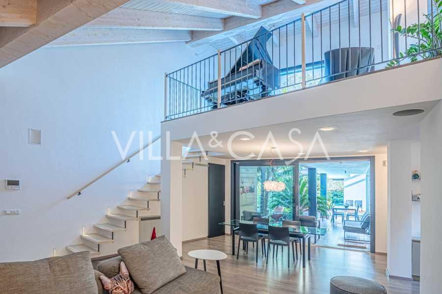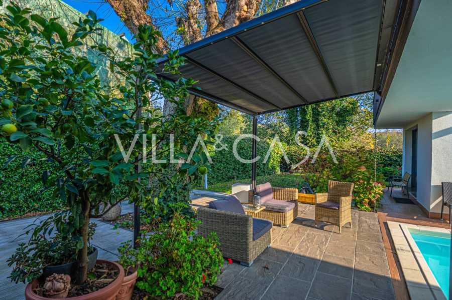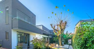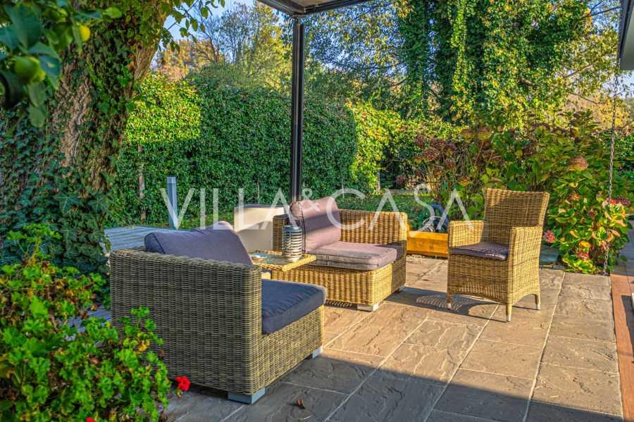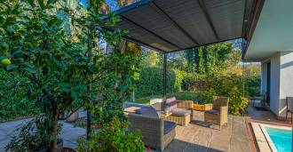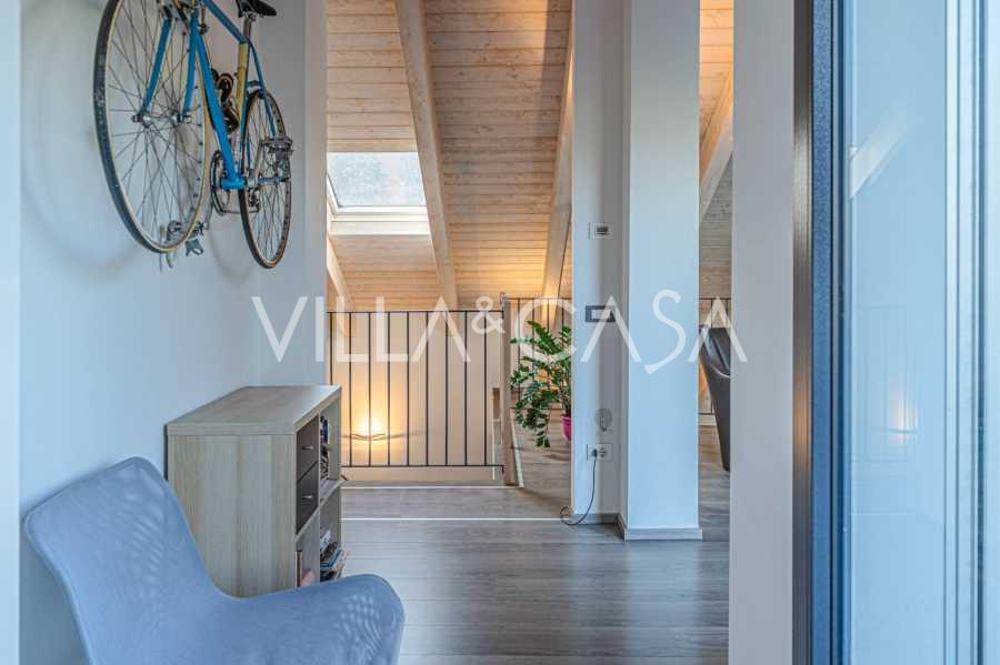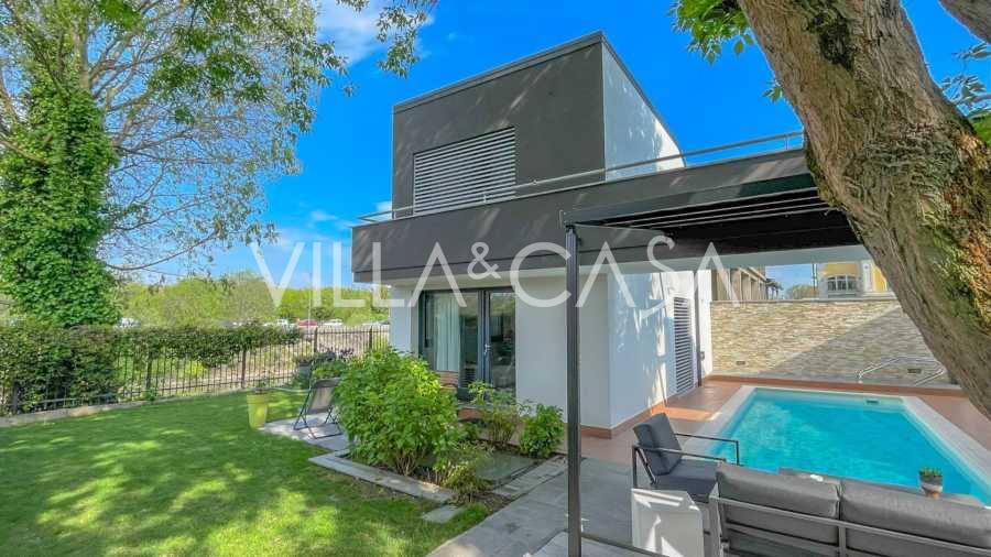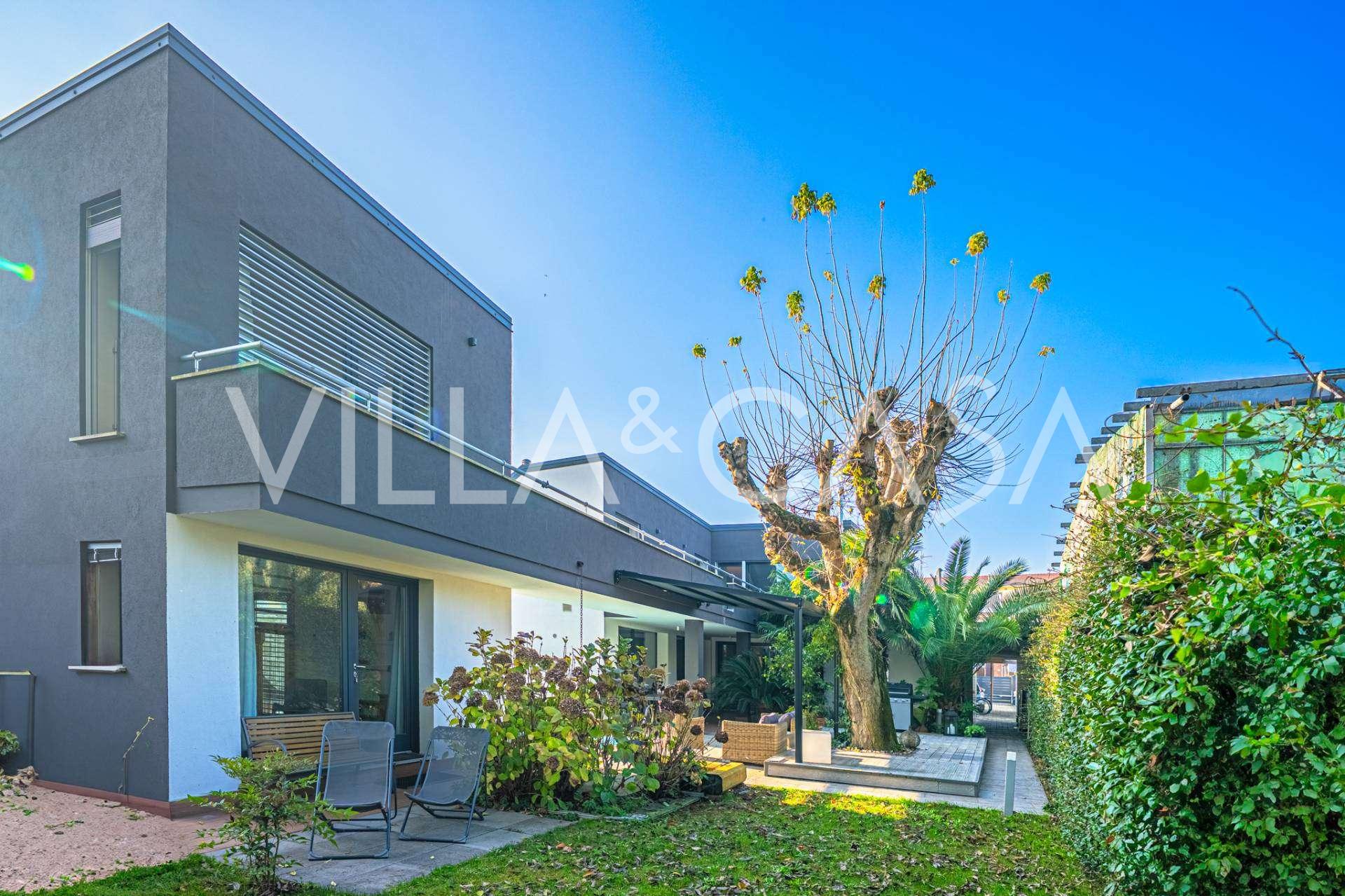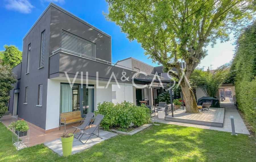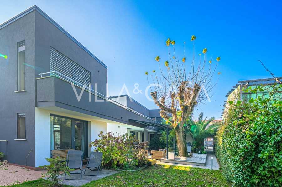 I hjertet av Ferrara, omgitt av velstelt grøntområder, selges et moderne hus bygget i 2014, med et totalt areal på rundt 360 m². Det er delt inn i to autonome deler: hovedhuset og et separat gjestehus. Begge delene er forbundet med en romslig felles terrasse i andre etasje, som skaper en helhetlig harmonisk plass og åpner opp for utsikt over hagen og rekreasjonsområdet.