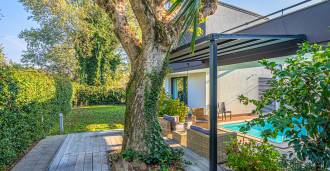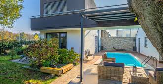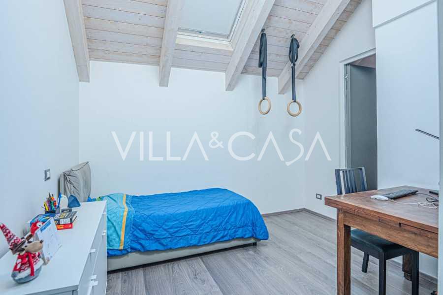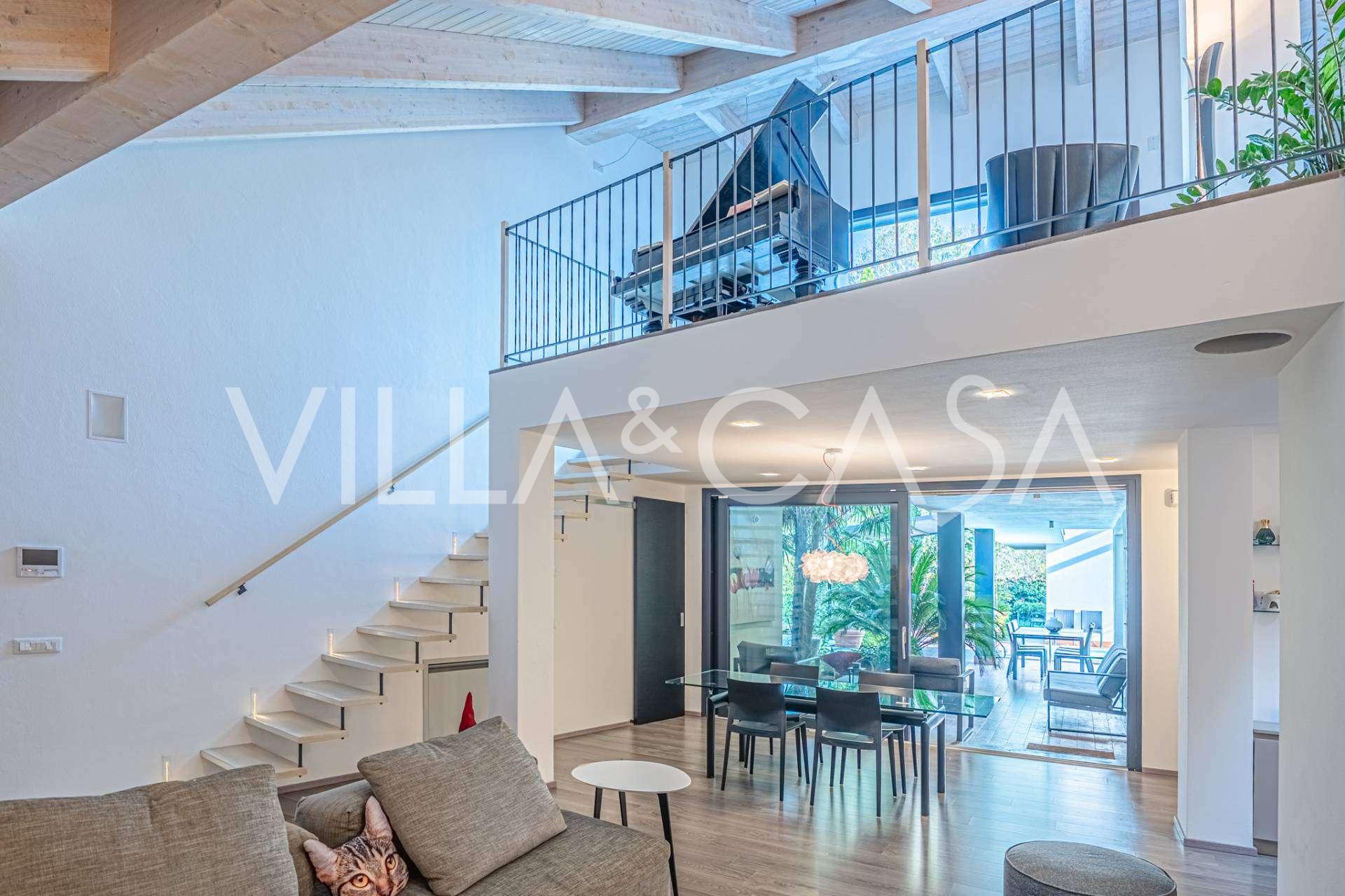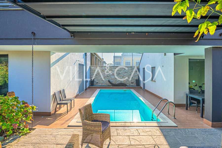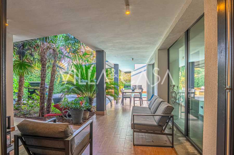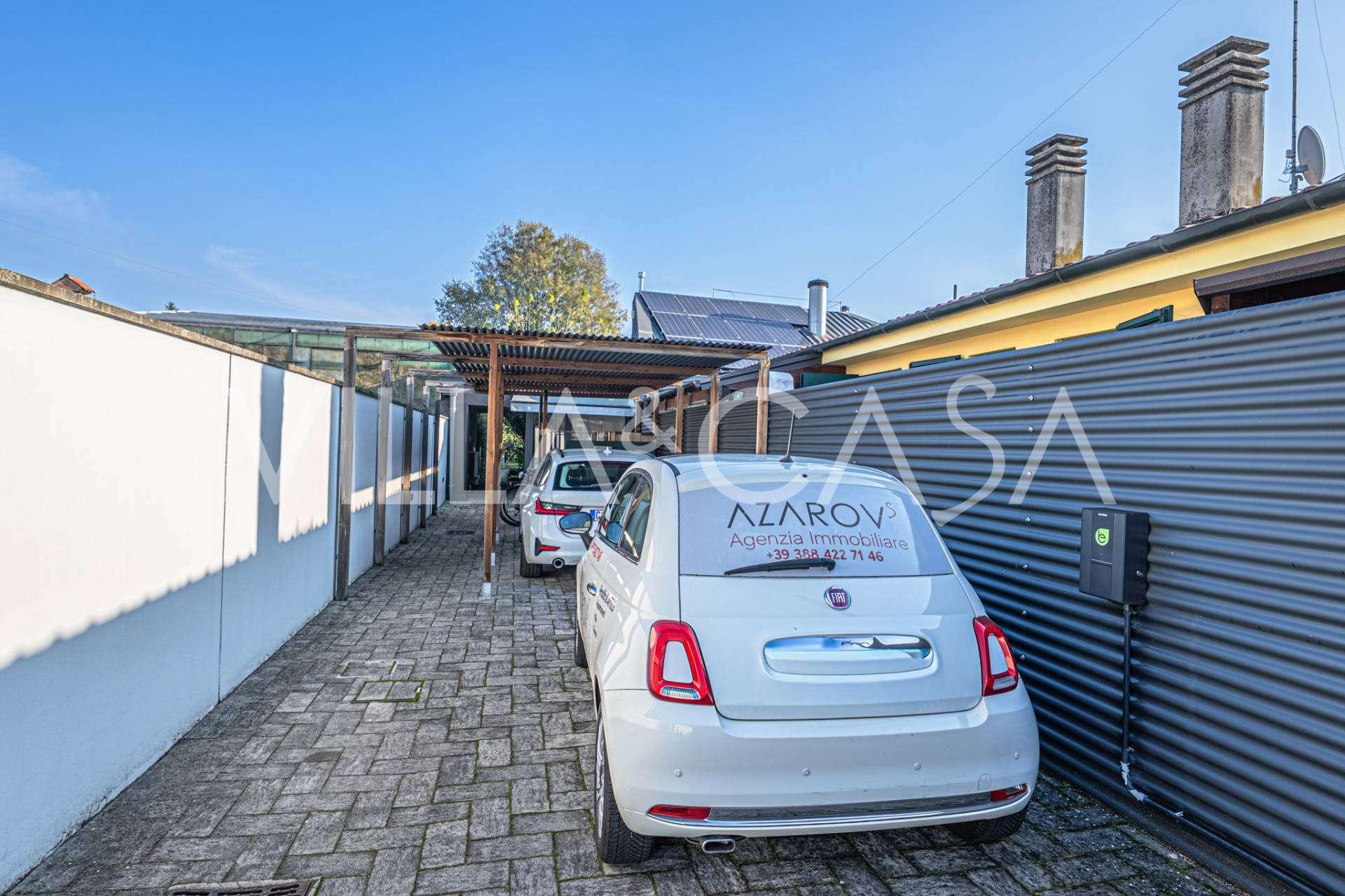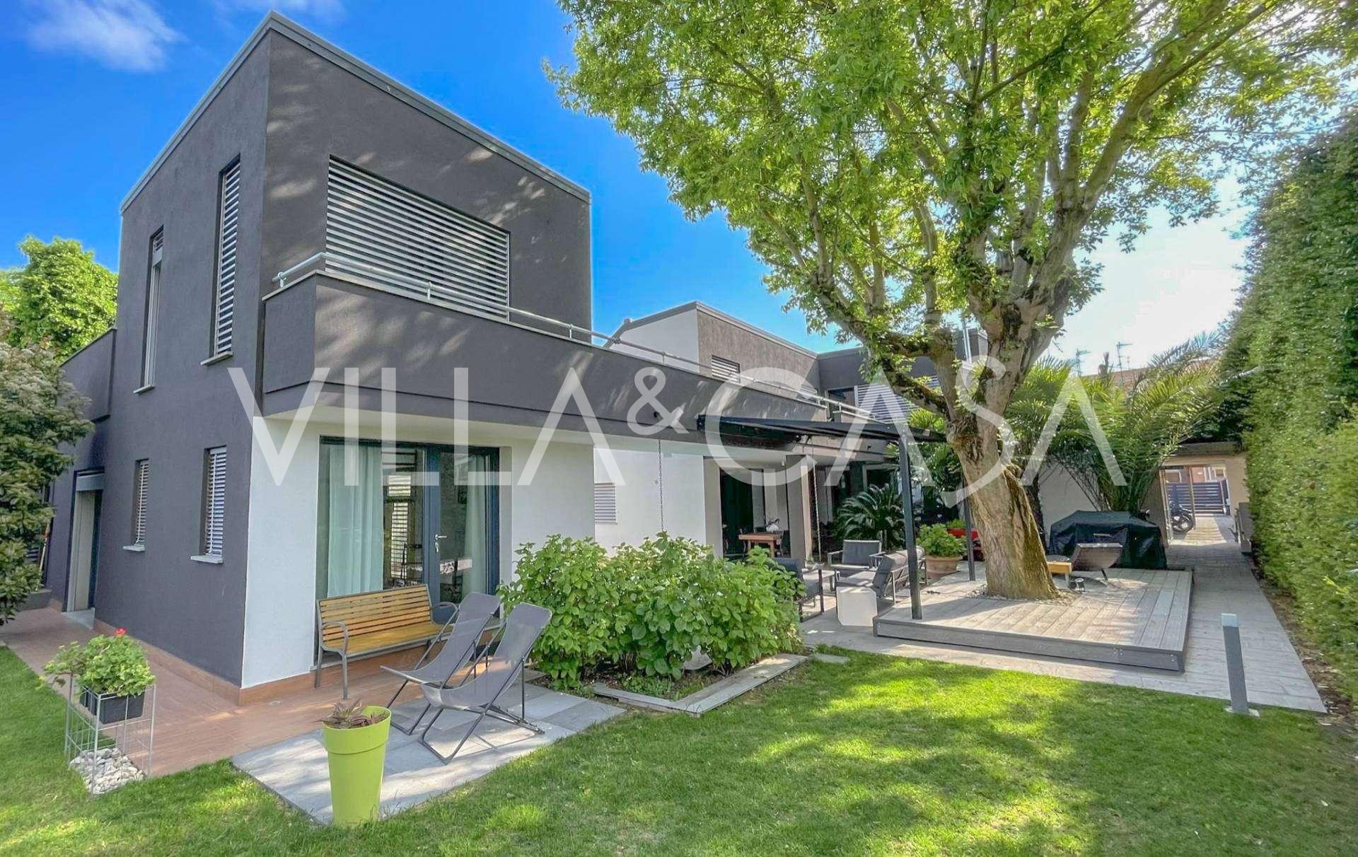 I hjertet av Ferrara, omgitt av velstelt grøntområder, selges et moderne hus bygget i 2014, med et totalt areal på rundt 360 m². Det er delt inn i to autonome deler: hovedhuset og et separat gjestehus. Begge delene er forbundet med en romslig felles terrasse i andre etasje, som skaper en helhetlig harmonisk plass og åpner opp for utsikt over hagen og rekreasjonsområdet.