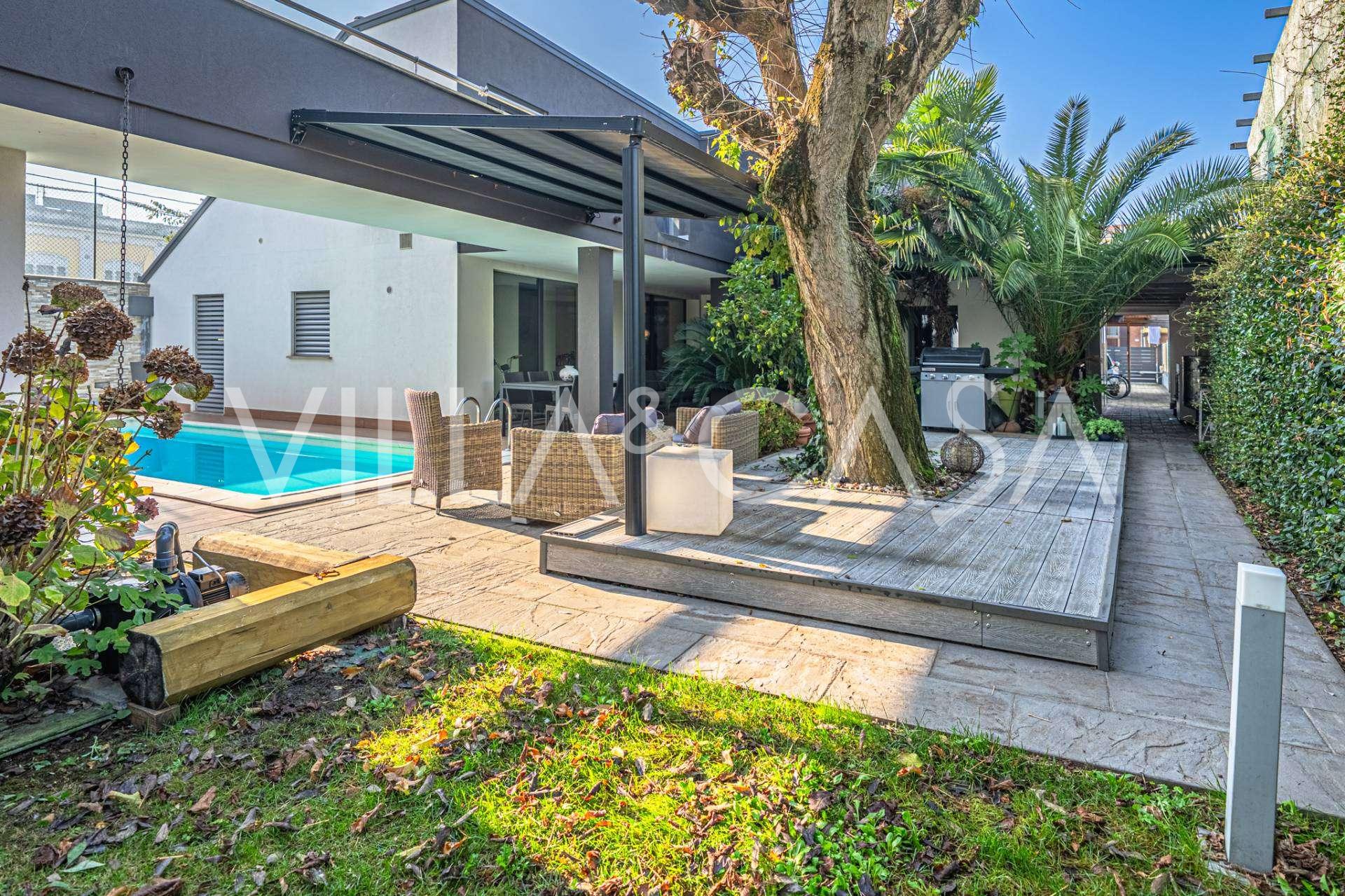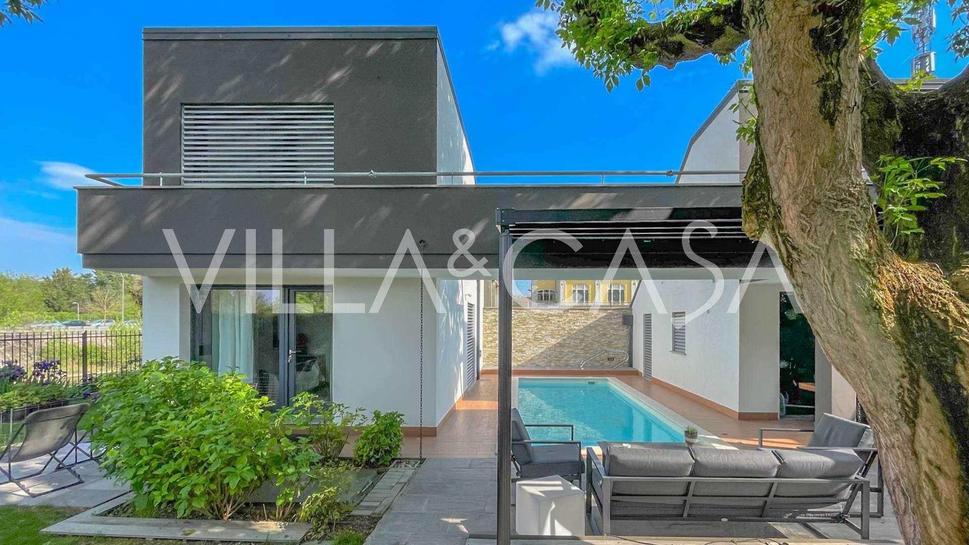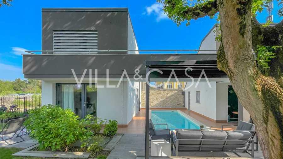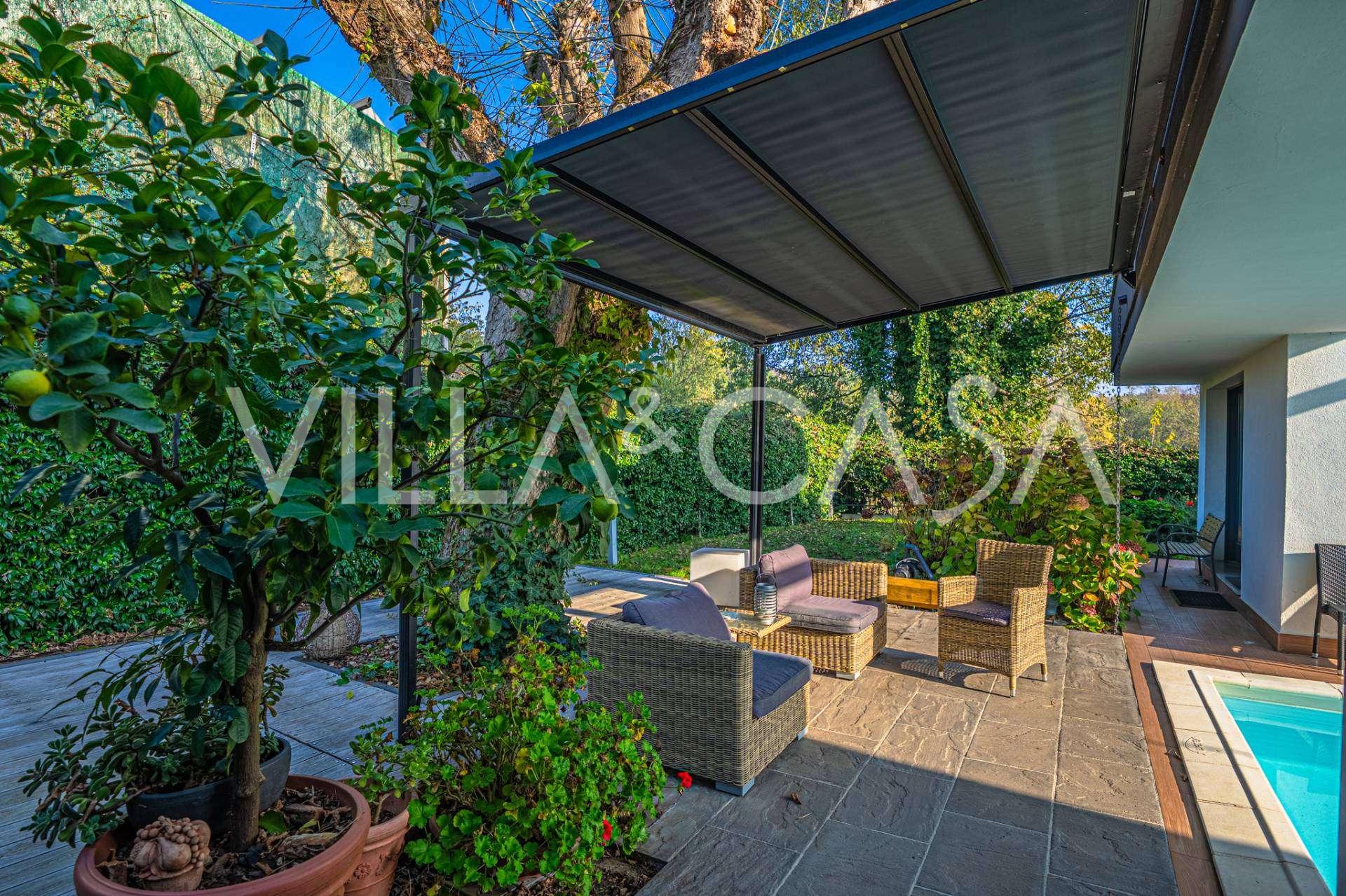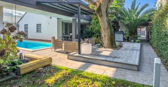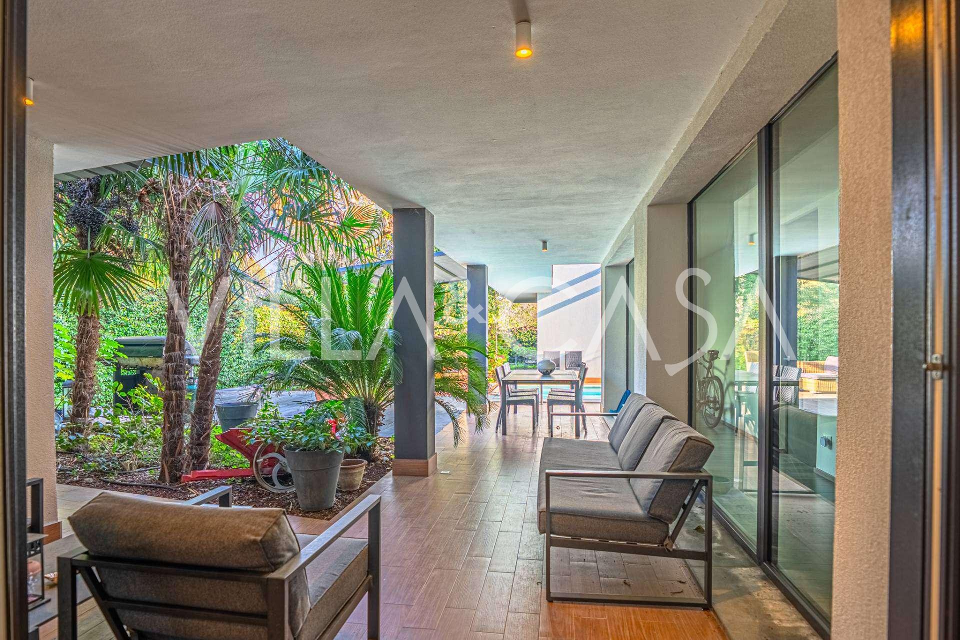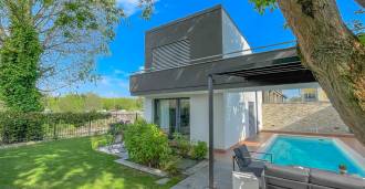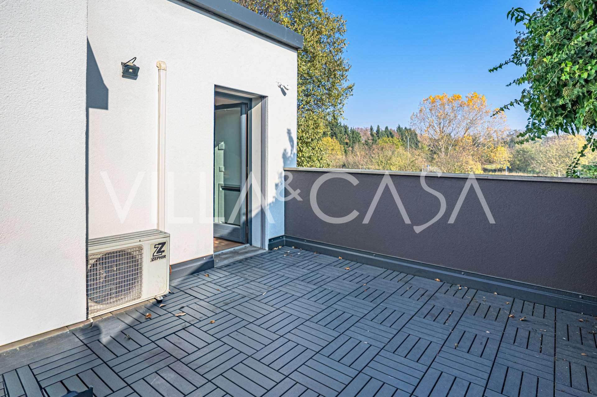 I hjertet av Ferrara, omgitt av velstelt grøntområder, selges et moderne hus bygget i 2014, med et totalt areal på rundt 360 m². Det er delt inn i to autonome deler: hovedhuset og et separat gjestehus. Begge delene er forbundet med en romslig felles terrasse i andre etasje, som skaper en helhetlig harmonisk plass og åpner opp for utsikt over hagen og rekreasjonsområdet.
