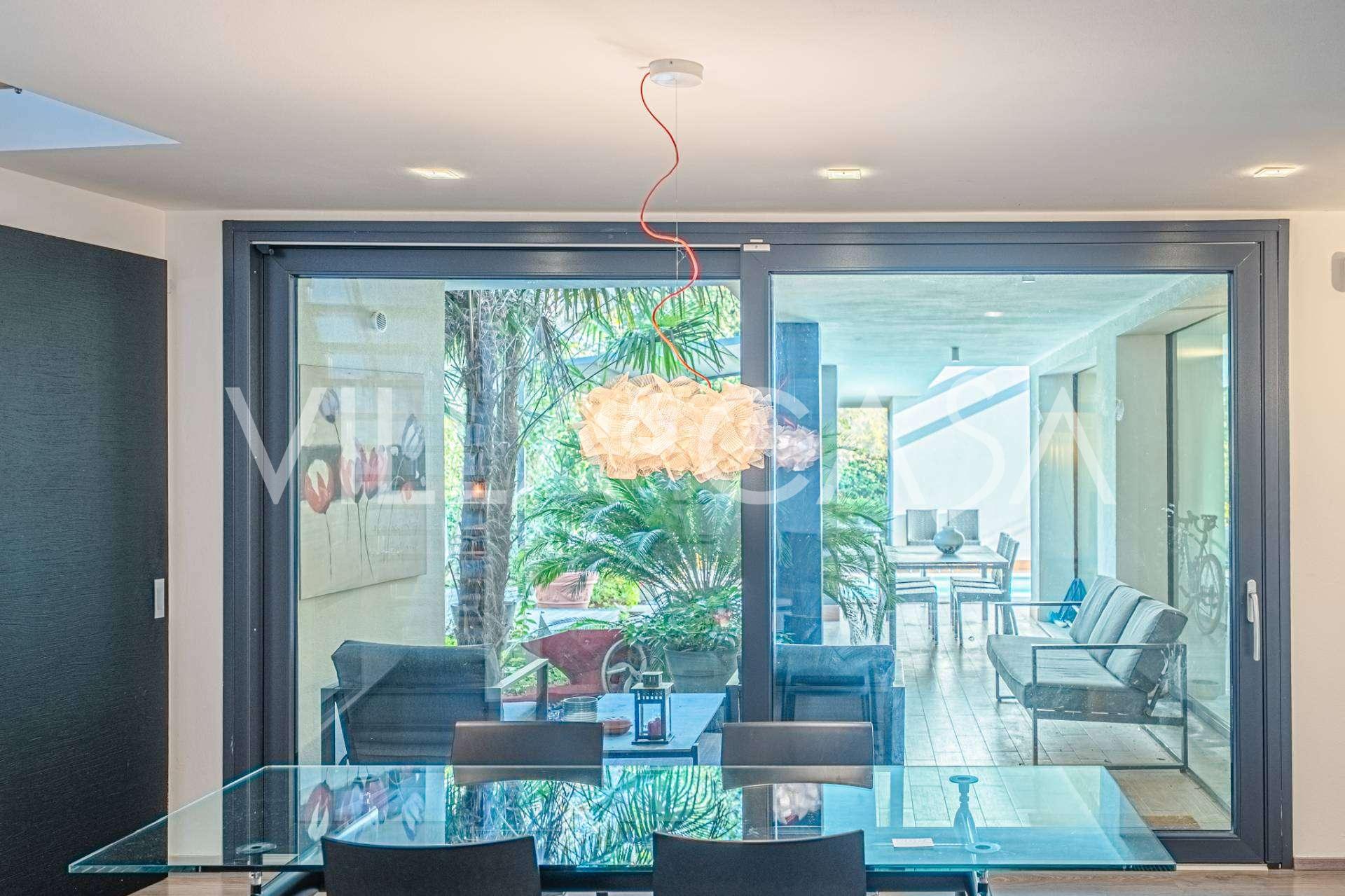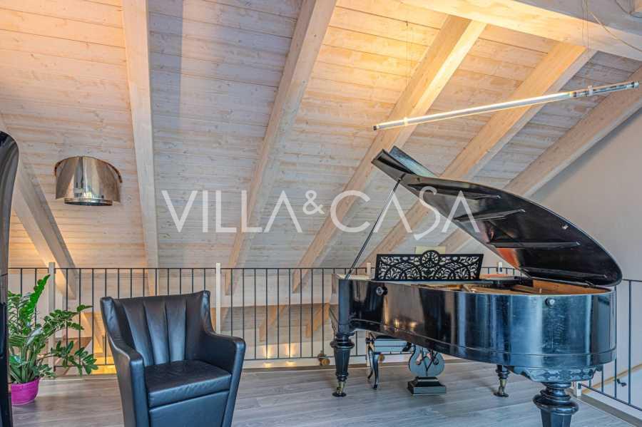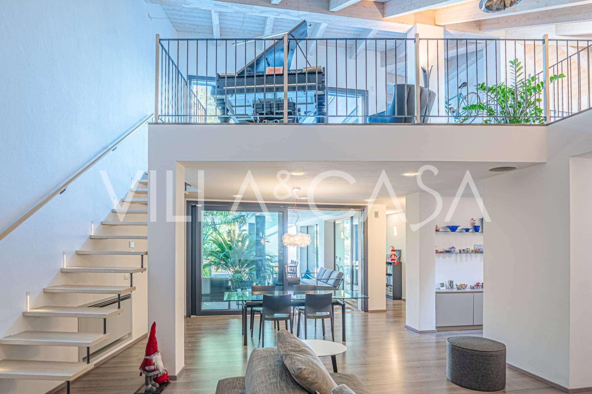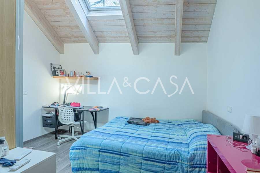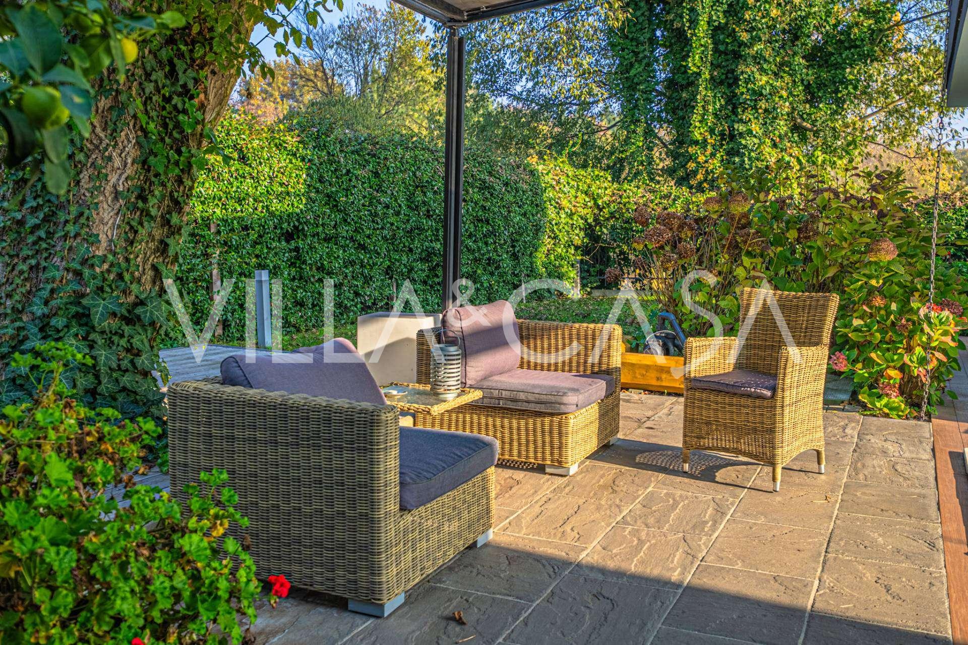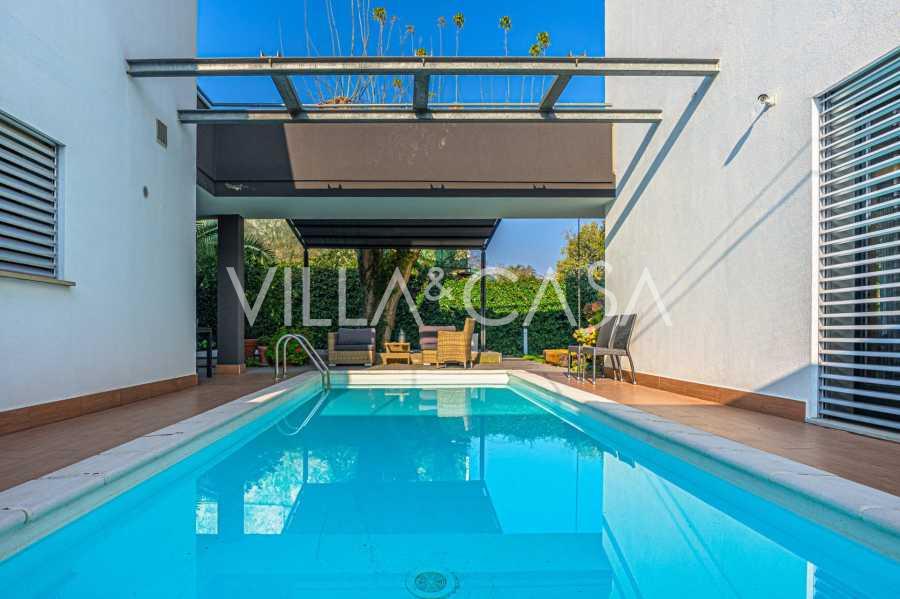 I hjertet av Ferrara, omgitt av velstelt grøntområder, selges et moderne hus bygget i 2014, med et totalt areal på rundt 360 m². Det er delt inn i to autonome deler: hovedhuset og et separat gjestehus. Begge delene er forbundet med en romslig felles terrasse i andre etasje, som skaper en helhetlig harmonisk plass og åpner opp for utsikt over hagen og rekreasjonsområdet.
