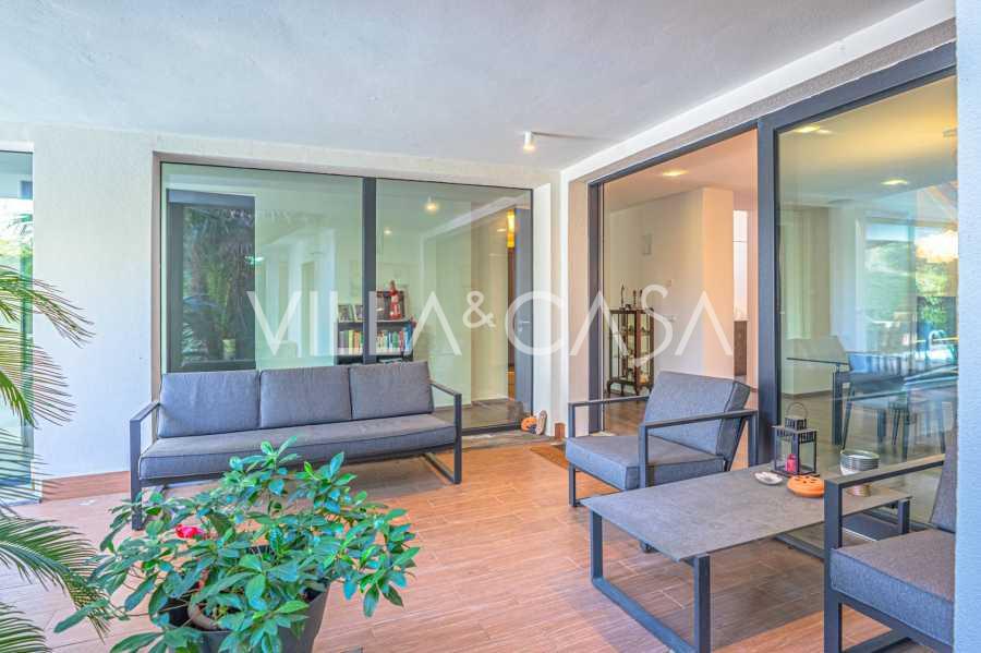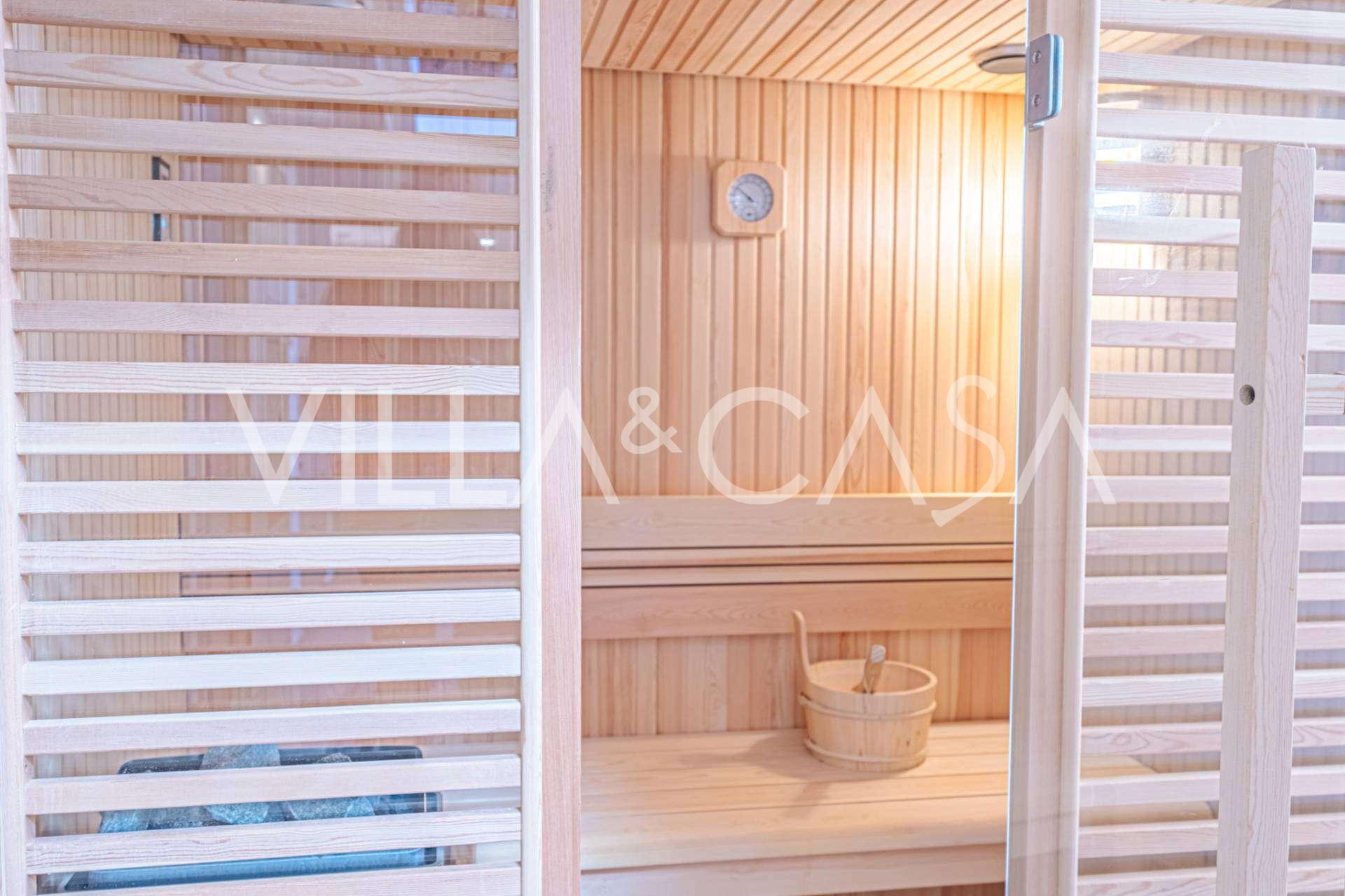 Første etasje: Lys stue med utgang til en stor overbygd terrasse og hage, moderne kjøkken med nytt utstyr, koselig grillområde, hovedsoverom med eget bad og garderobe, ekstra bad for gjester, finsk sauna, andre soverom med bad.