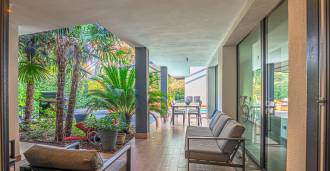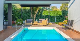 På tomten finnes en velstelt hage, stort utendørs basseng, garasje og 4 overbygde parkeringsplasser, grillområde og flere terrasser, hvorav en er overbygd for komfortabel rekreasjon selv i dårlig vær.