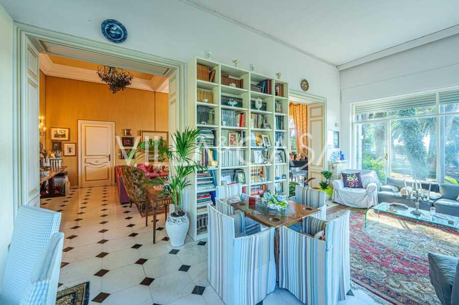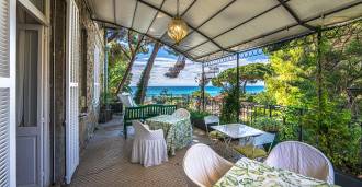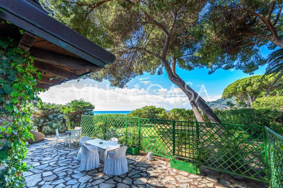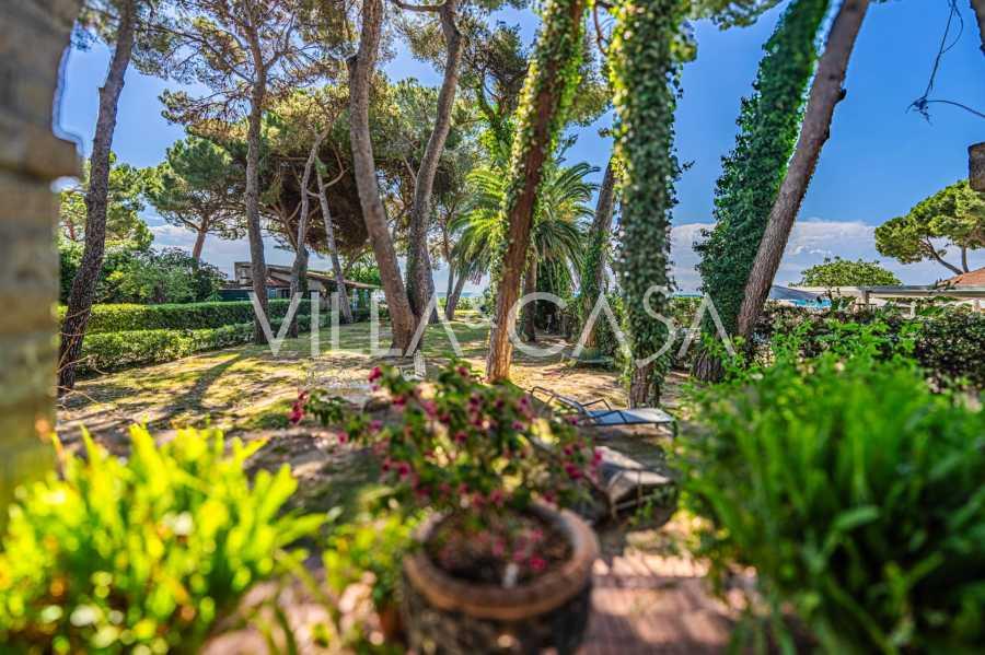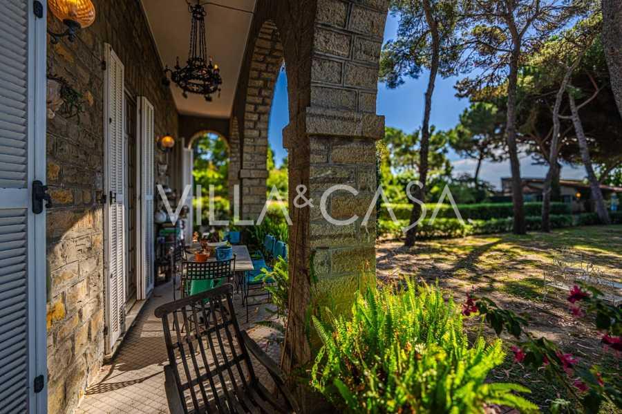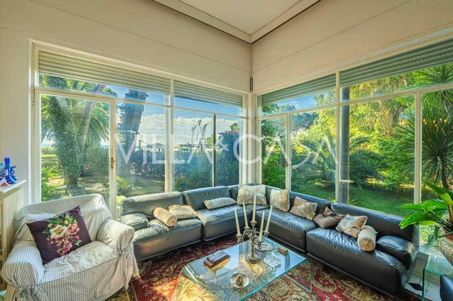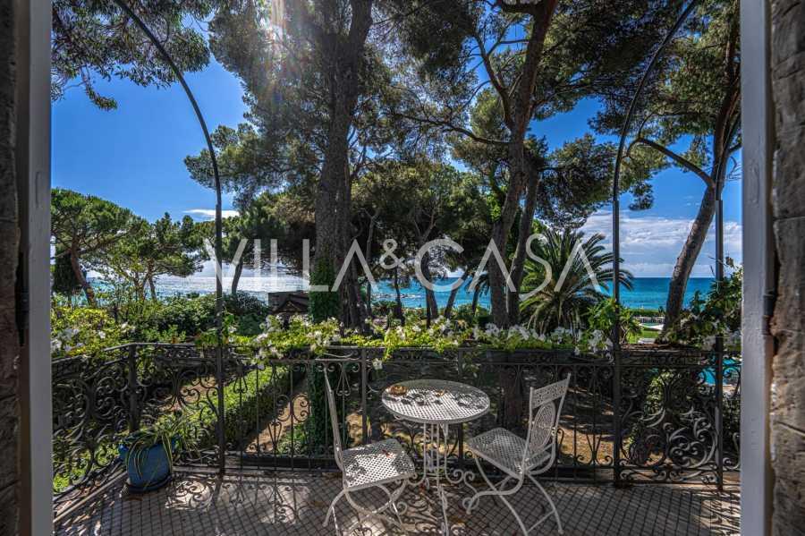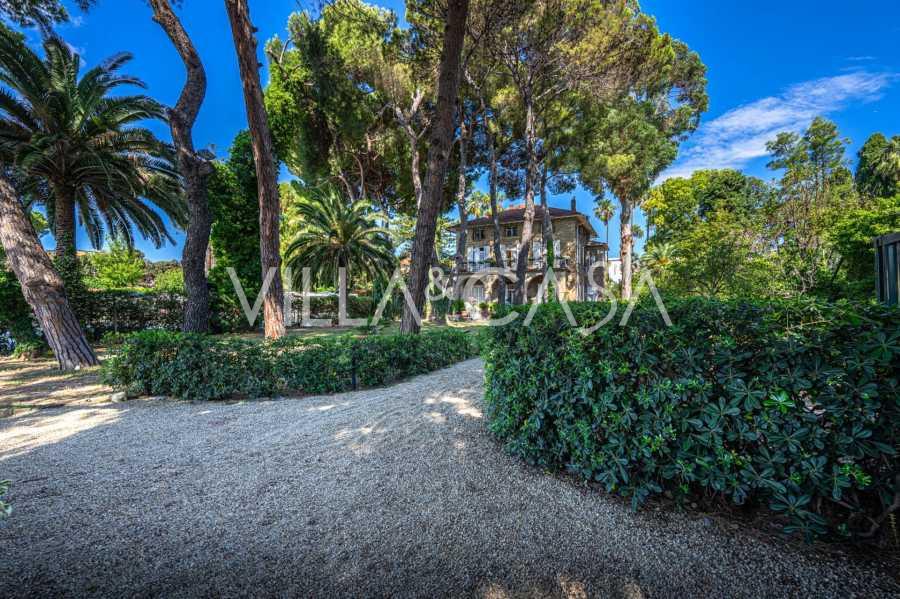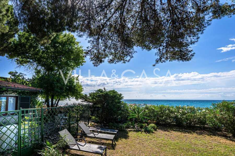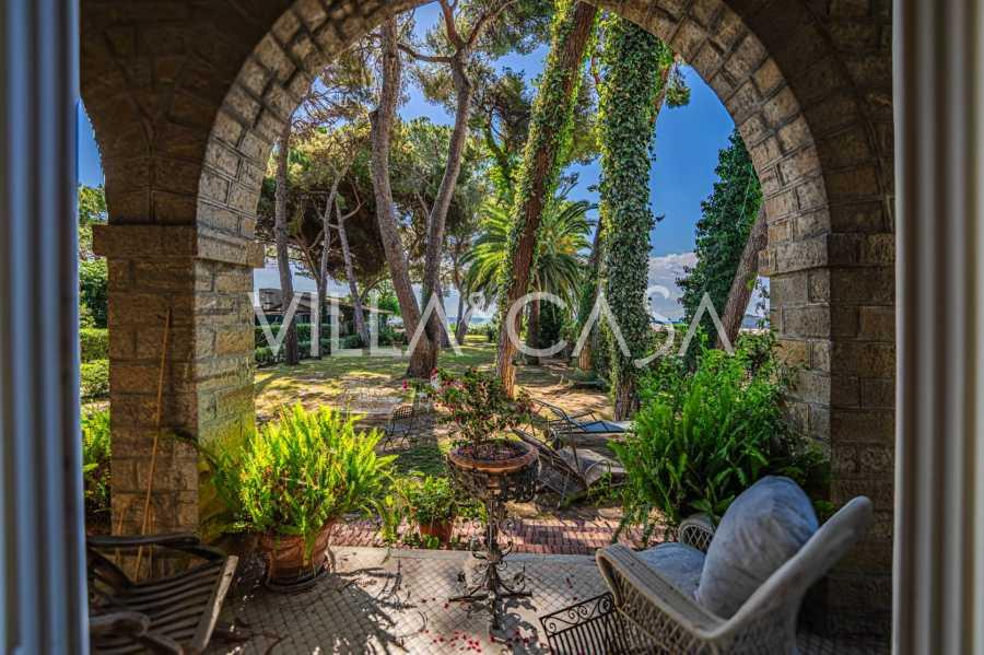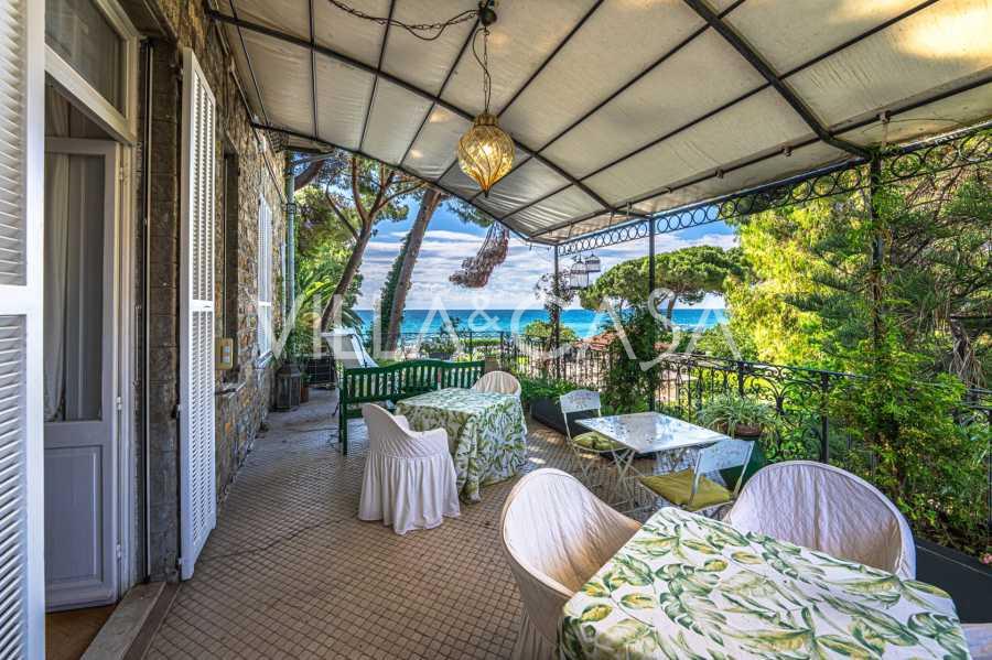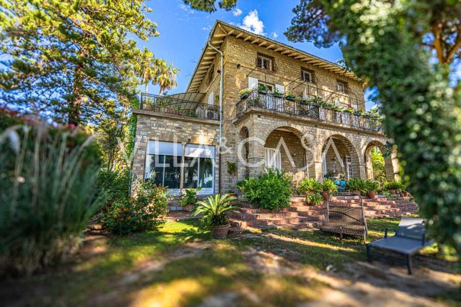En stilfull villa i engelsk stil ved strandlinjen i Diano Marina er til salgs. Villaen har et areal på ca. 628 m2 og strekker seg over fire nivåer. Den har direkte tilgang til sjøen og en sandstrand. Villaen er omgitt av en stor park på ca. 5000 m2 med gamle middelhavsfuru.