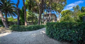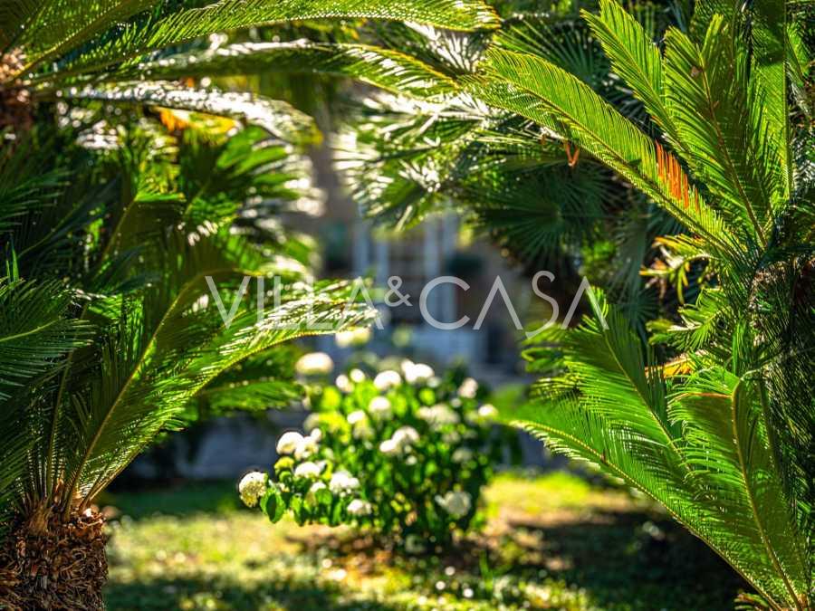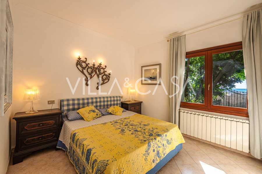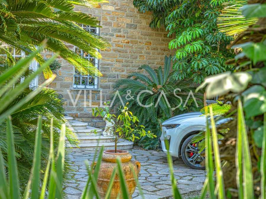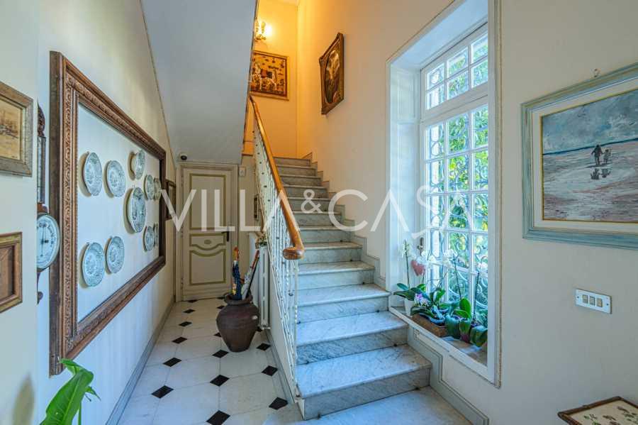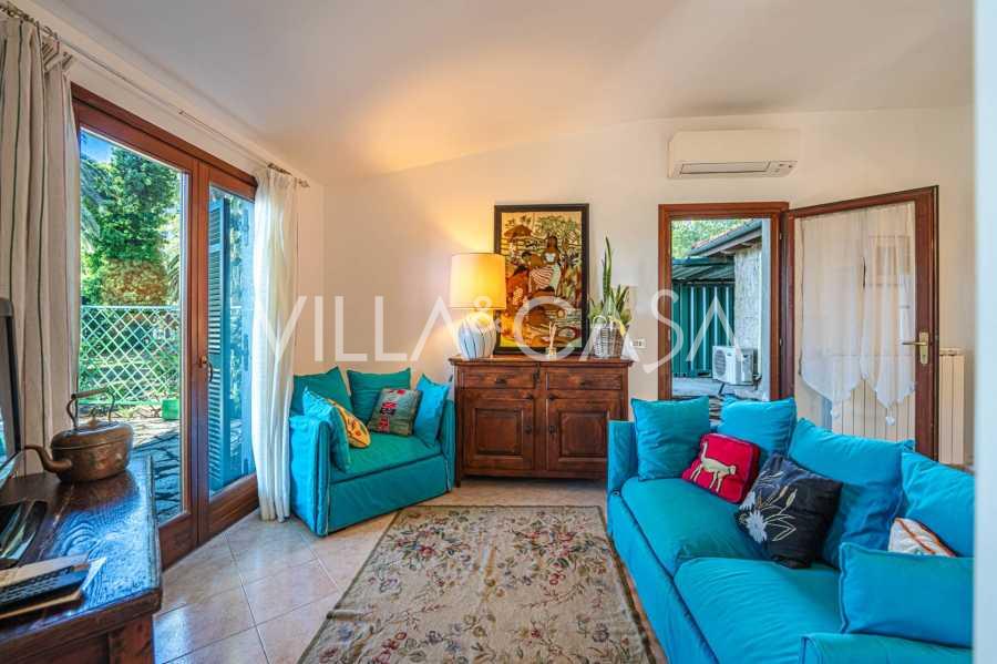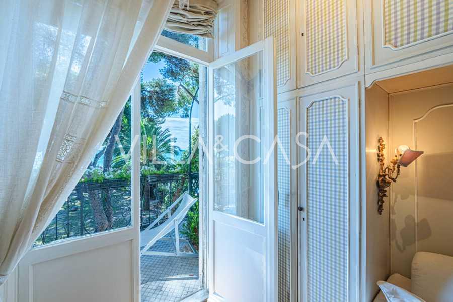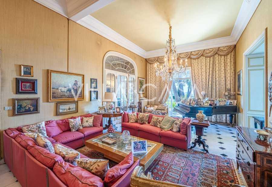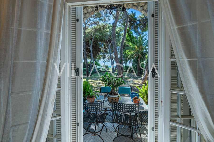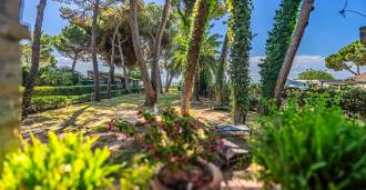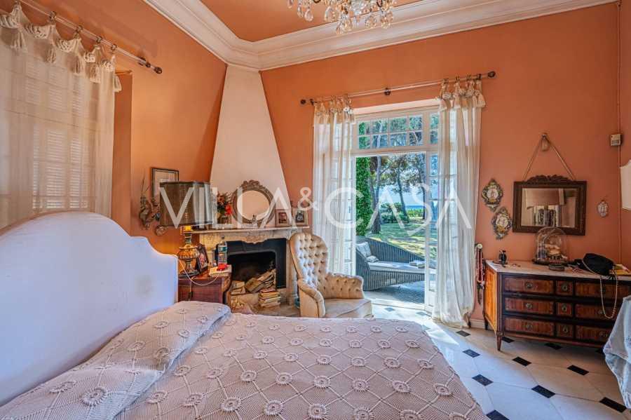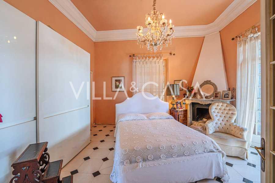 En stilfull villa i engelsk stil ved strandlinjen i Diano Marina er til salgs. Villaen har et areal på ca. 628 m2 og strekker seg over fire nivåer. Den har direkte tilgang til sjøen og en sandstrand. Villaen er omgitt av en stor park på ca. 5000 m2 med gamle middelhavsfuru.