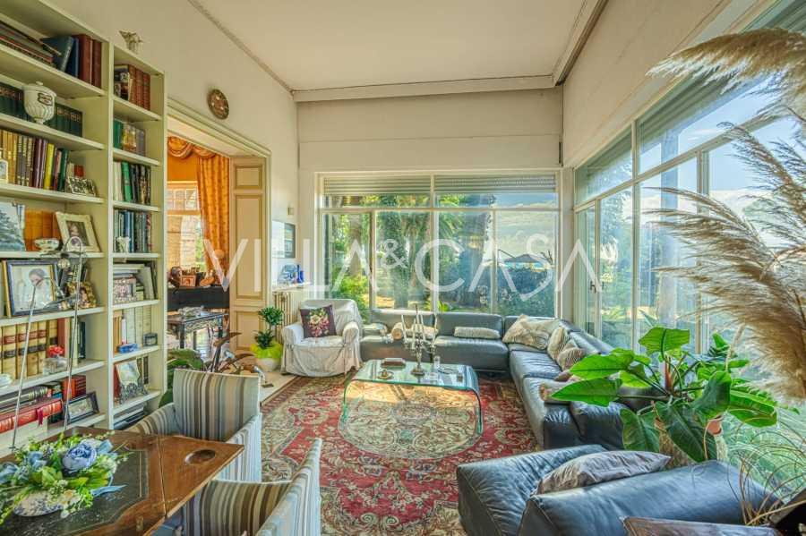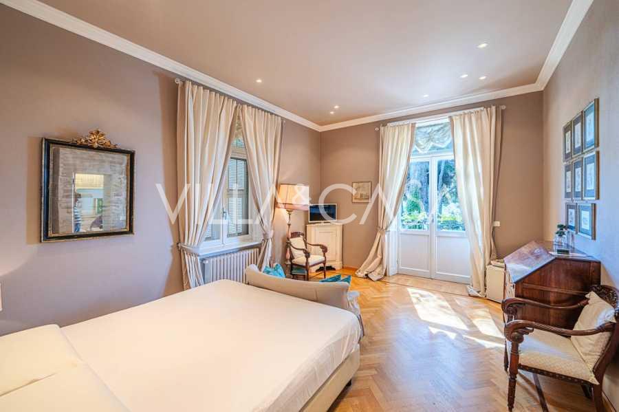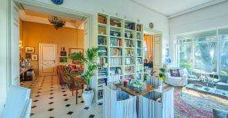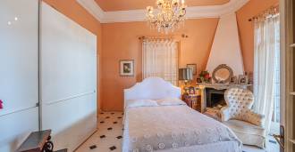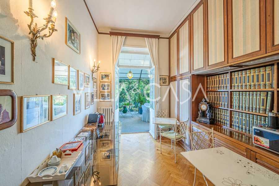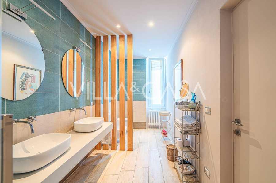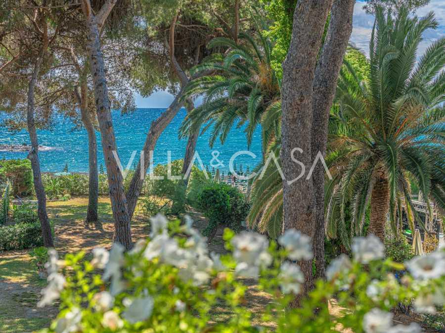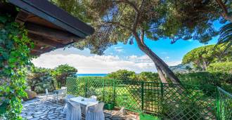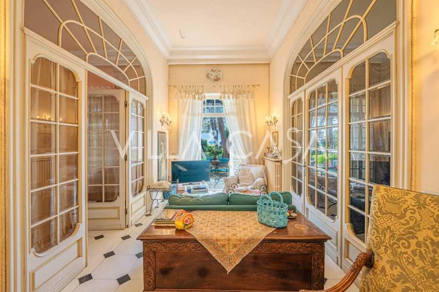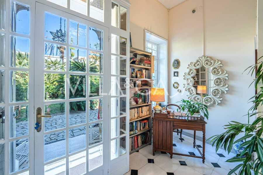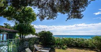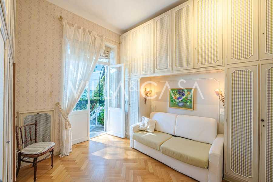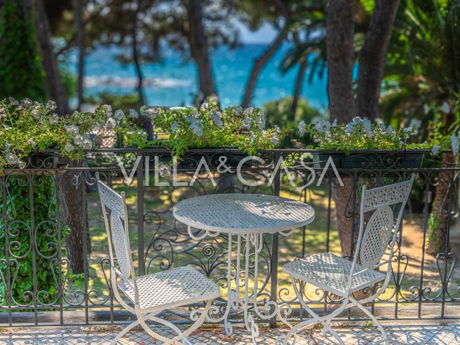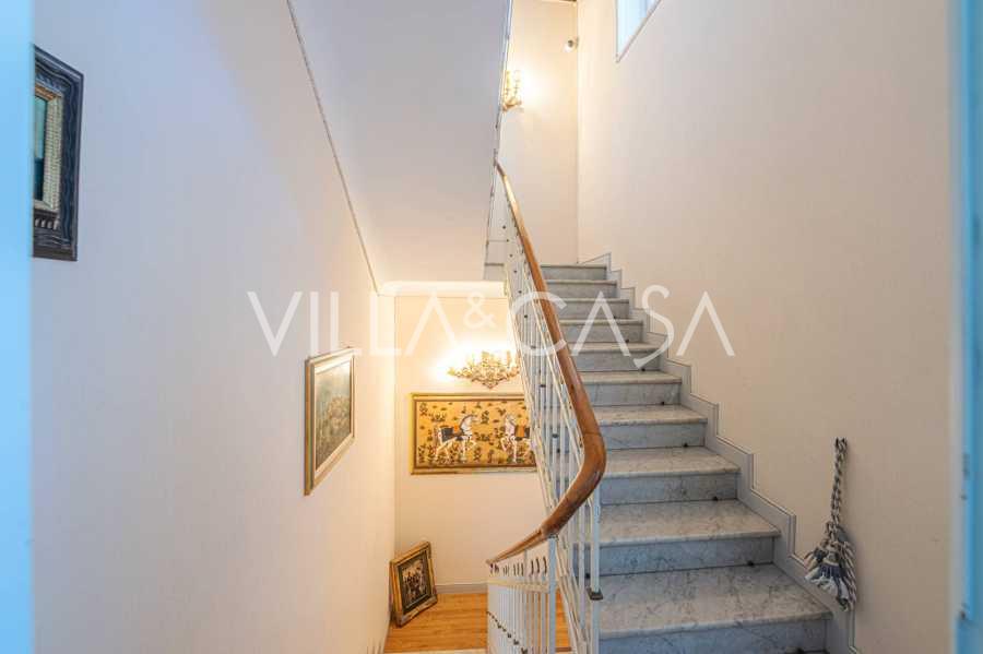 En stilfull villa i engelsk stil ved strandlinjen i Diano Marina er til salgs. Villaen har et areal på ca. 628 m2 og strekker seg over fire nivåer. Den har direkte tilgang til sjøen og en sandstrand. Villaen er omgitt av en stor park på ca. 5000 m2 med gamle middelhavsfuru.