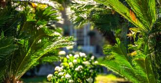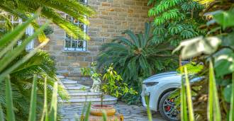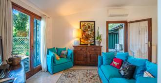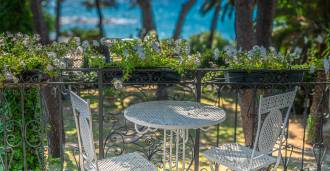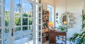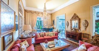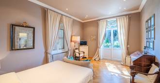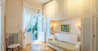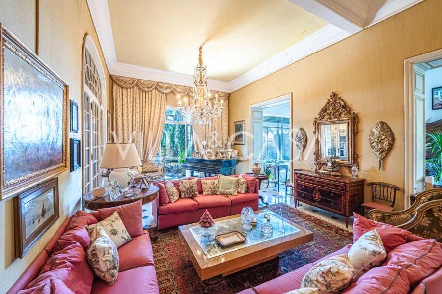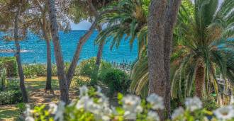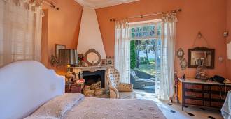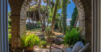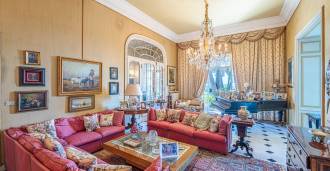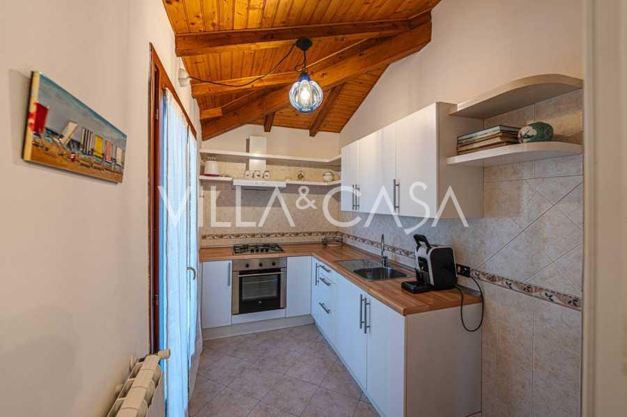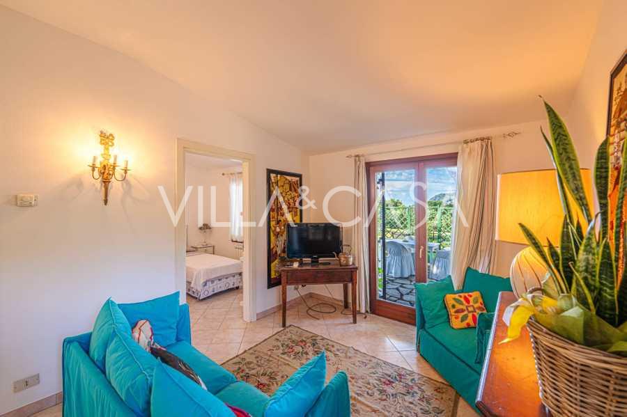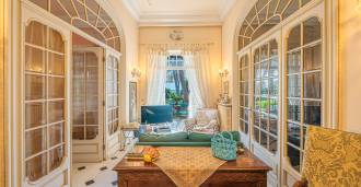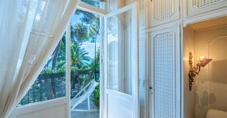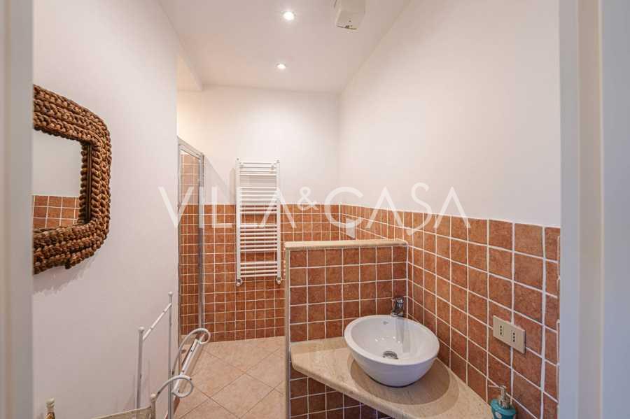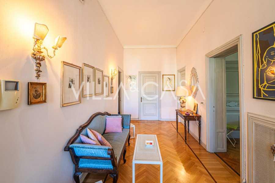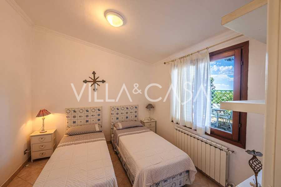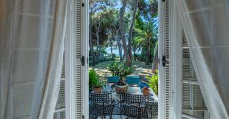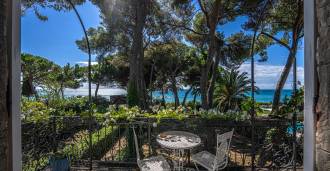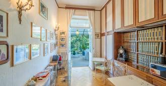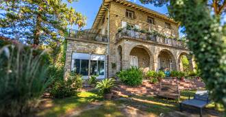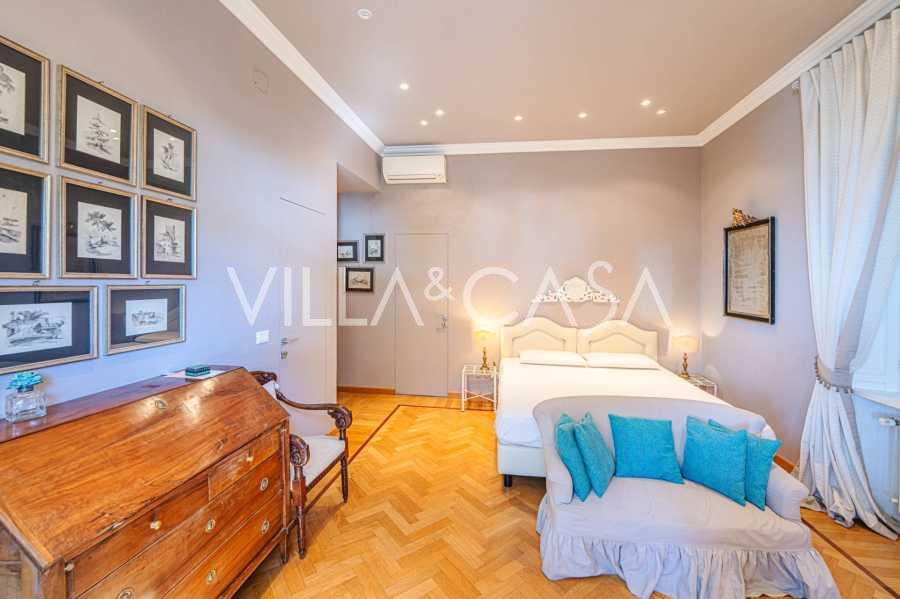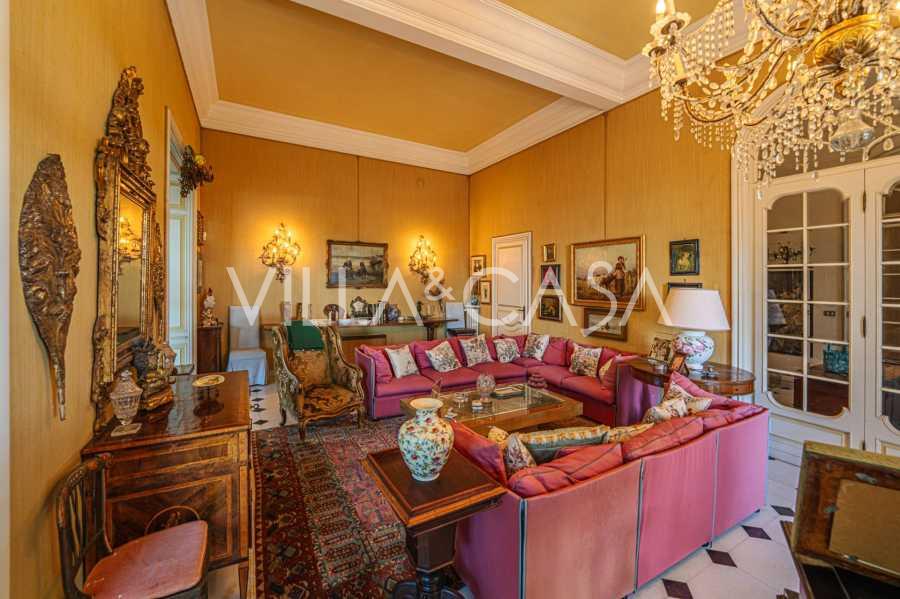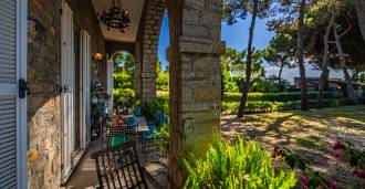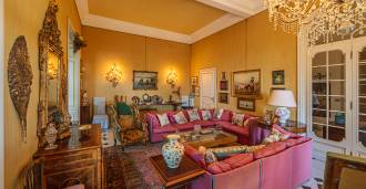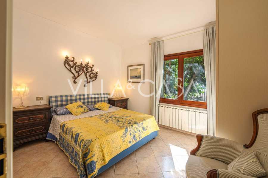 En stilfull villa i engelsk stil ved strandlinjen i Diano Marina er til salgs. Villaen har et areal på ca. 628 m2 og strekker seg over fire nivåer. Den har direkte tilgang til sjøen og en sandstrand. Villaen er omgitt av en stor park på ca. 5000 m2 med gamle middelhavsfuru.