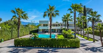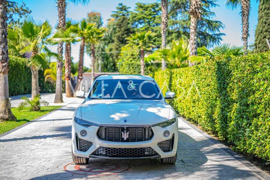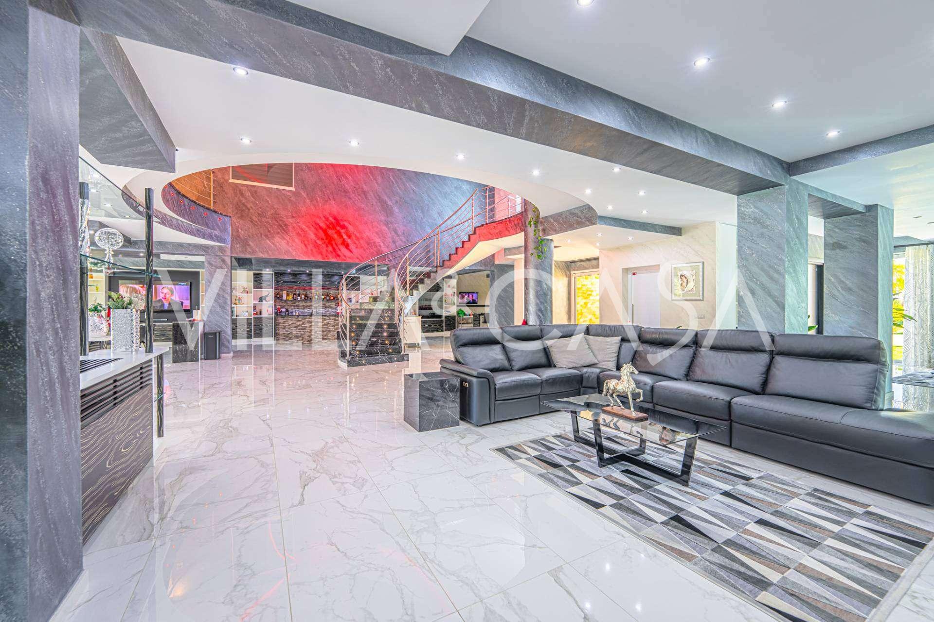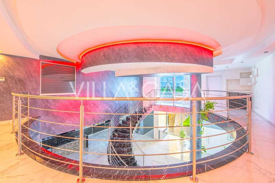 Den moderne boligen, med et areal på omtrent 2000 kvm, er fordelt over to nivåer, forbundet med en innvendig heis og en spiraltrapp. Romslige og lyse rom inkluderer fem elegante soverom og ni bad, dekorert med materialer av høy kvalitet som fremhever interiørets status.
