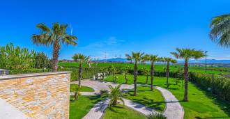 Villaens hage, dekorert med palmer, en fontene med nattbelysning og et romslig avslapningsområde, tilbyr ideelle forhold for å ta imot gjester og tilbringe kvelder utendørs ved bassenget eller i den skyggefulle loggiaen.