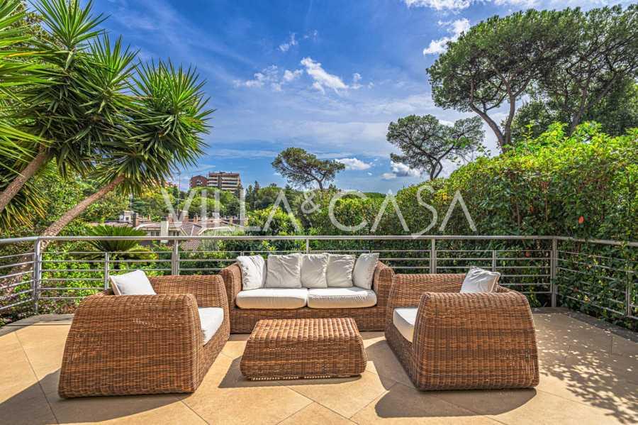 Landskapshagen, skapt med spesiell oppmerksomhet på detaljer, er utsmykket med sjeldne tresorter, inkludert en majestetisk magnolia og et hundre år gammelt oliventre. Den staselige gårdsplassen har plass til flere biler, i tillegg til at det er en lukket garasje for én bil. Den ideelle beliggenheten til residensen kombinerer sjelden stillhet og strategisk plassering: i gangavstand finnes de viktigste tjenestene og enkel tilgang til parken med EUR-sjøen, samt Laurentina og Cristoforo Colombo avenyer. På bare noen få minutter kan du nå sentrum av Roma.